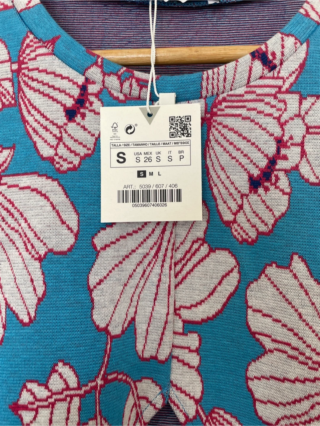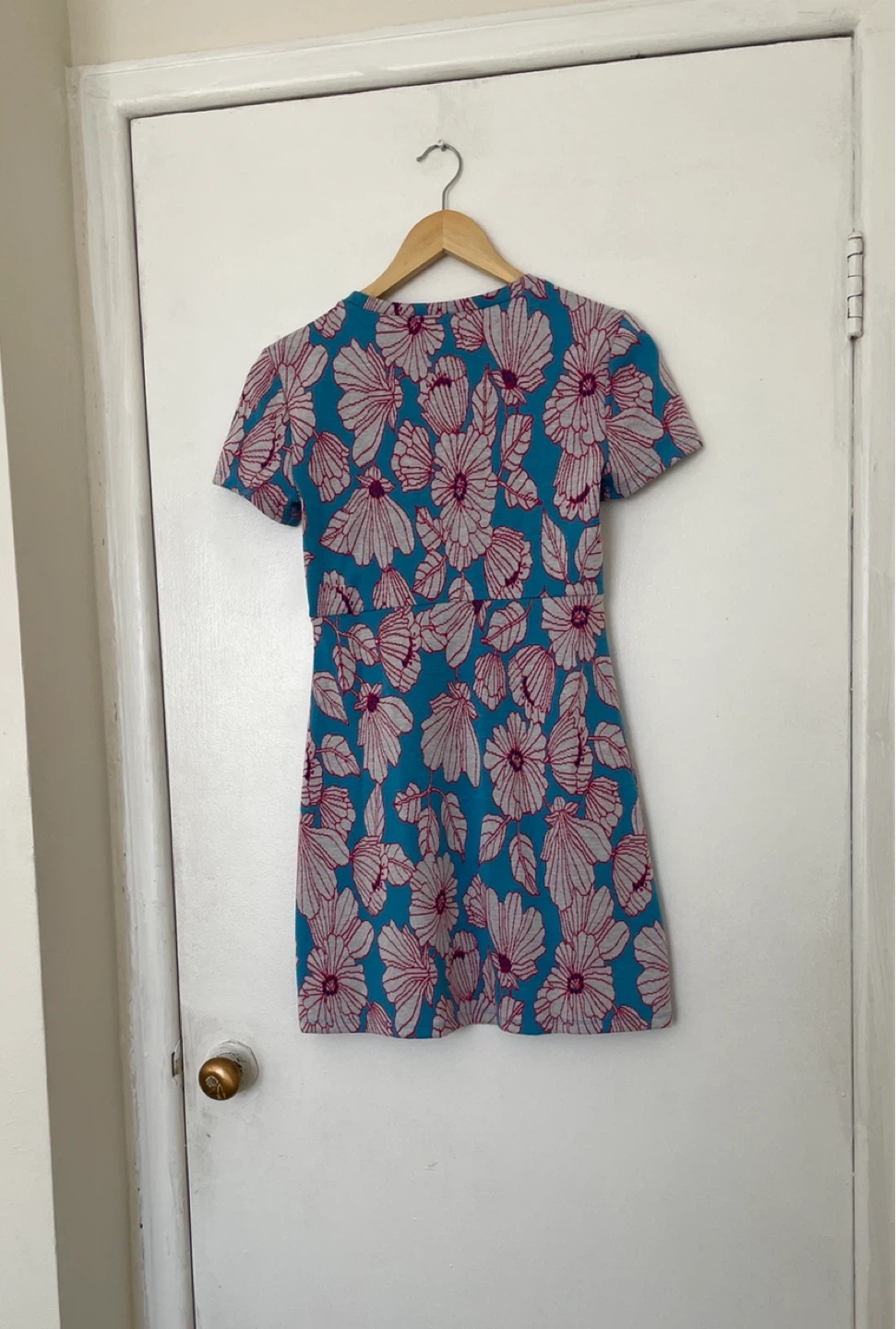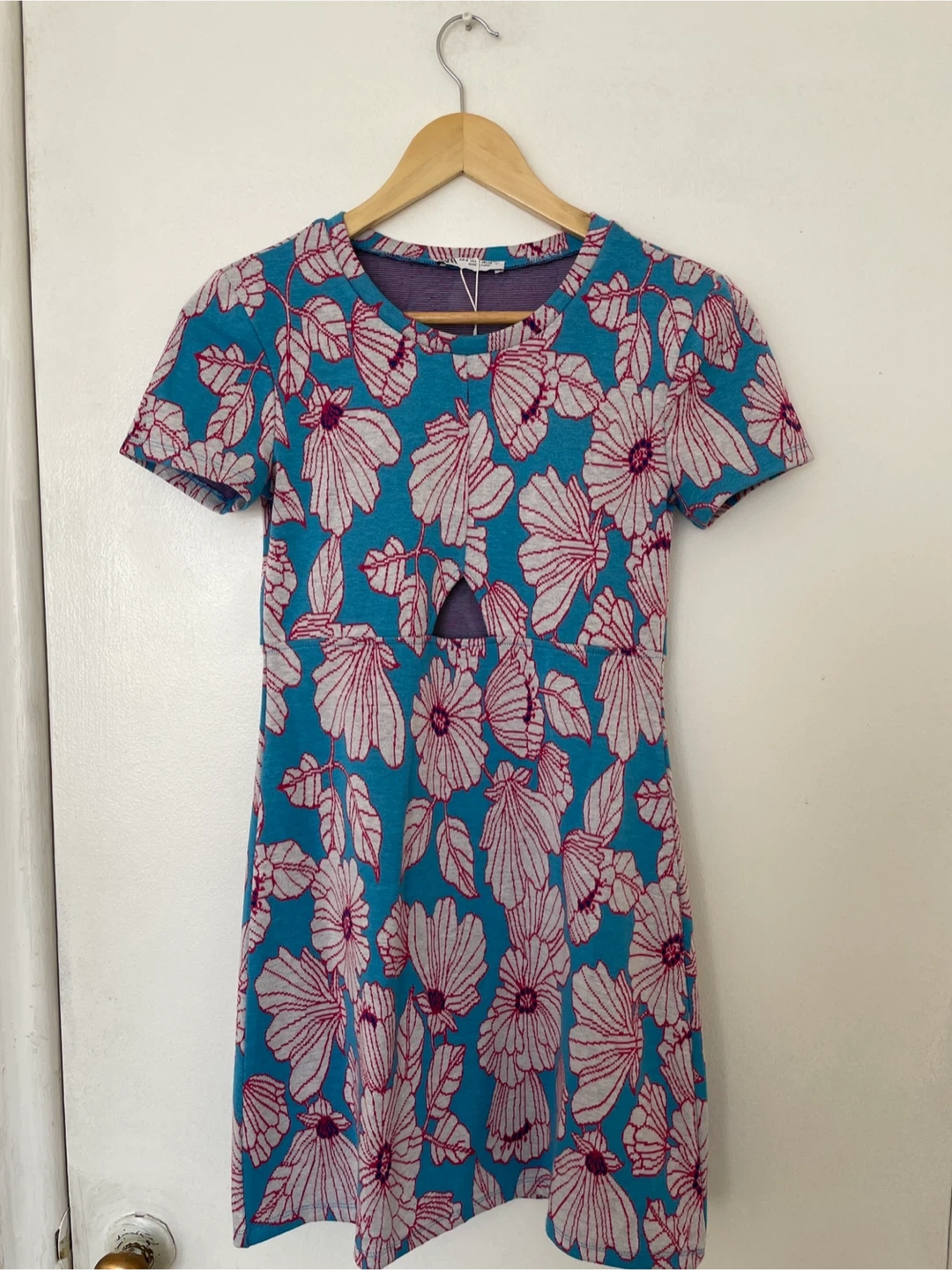 A short-sleeve blue dress featuring a vibrant floral pattern in pink and grey. It has a small cutout detail at the chest. Material is comfortable knit.