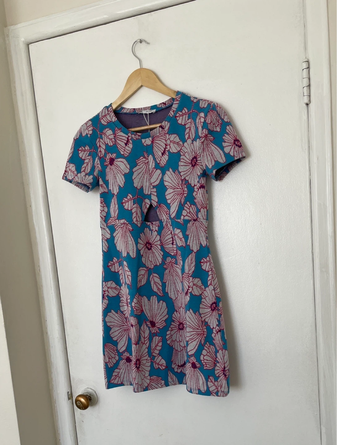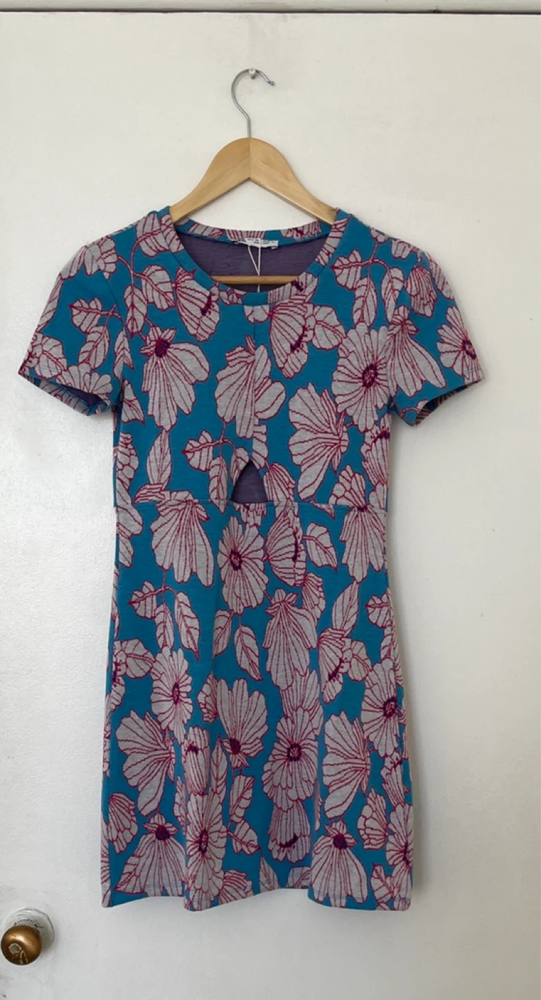 A short-sleeve blue dress featuring a vibrant floral pattern in pink and grey. It has a small cutout detail at the chest. Material is comfortable knit.