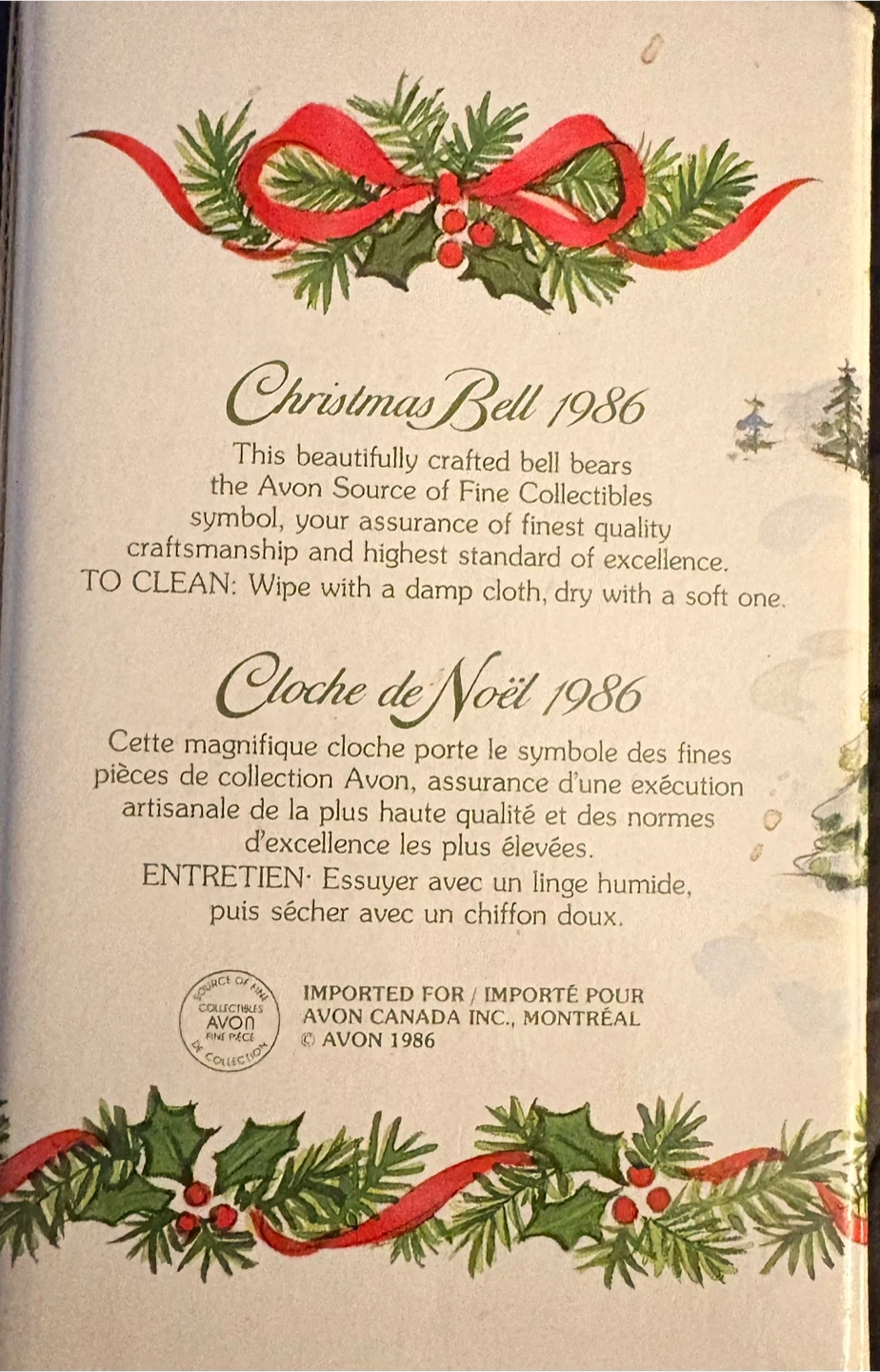 Selling an Avon Christmas Bell from 1986! This beautifully crafted bell bears the Avon Source of Fine Collectibles symbol, your assurance of fine quality craftsmanship and highest standard of excellence. It can be cleaned with a damp cloth and dried with a soft one. The box is included!