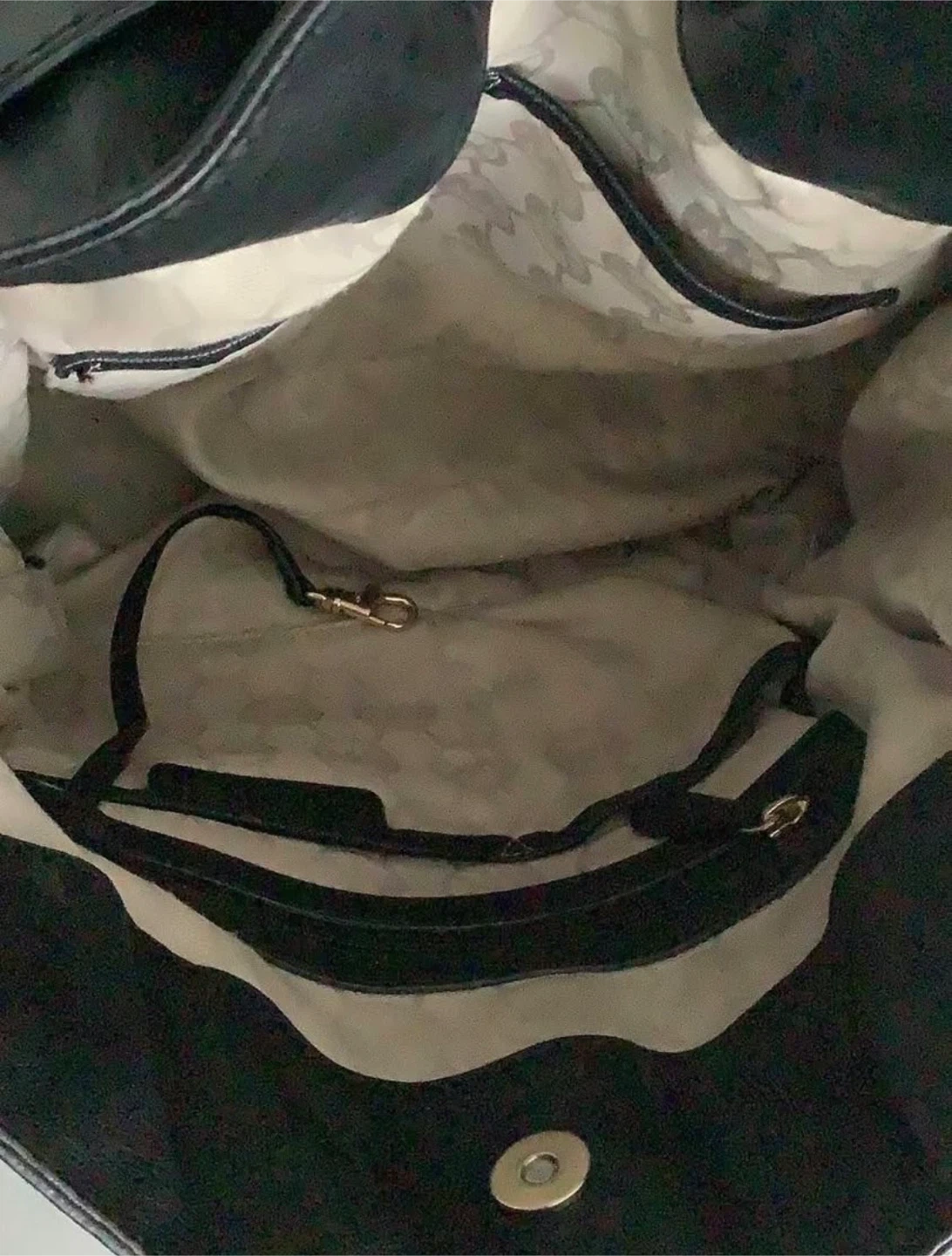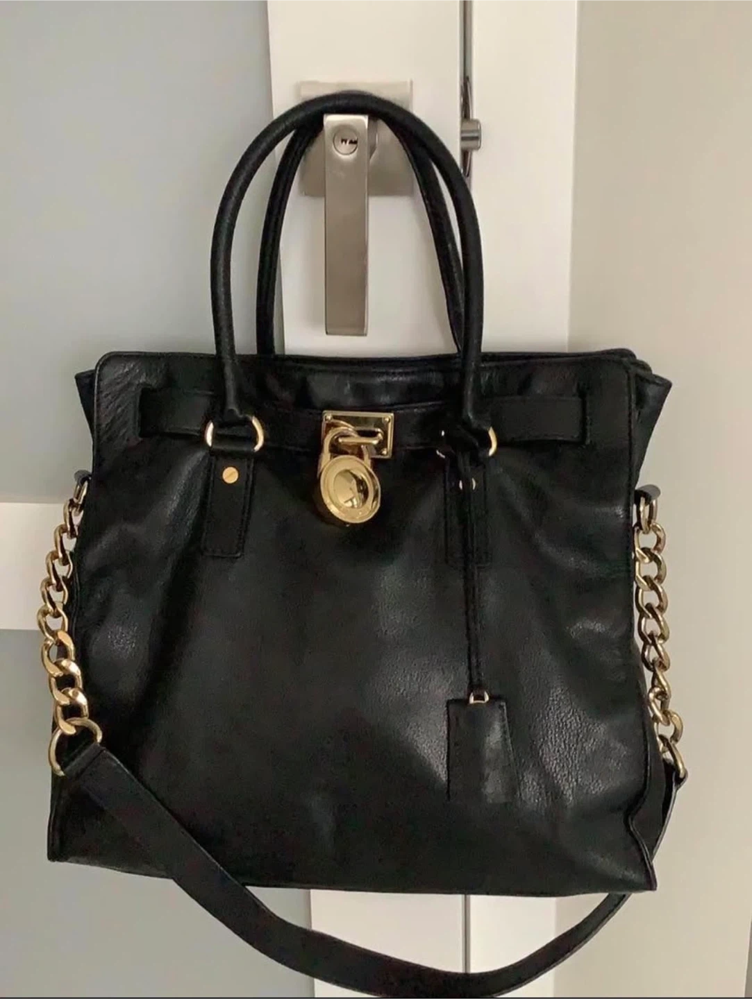 This is an excellent condition Michael Kors black leather bag. It features gold hardware and a chain detail on the side. The bag has a top handle and a removable crossbody strap.