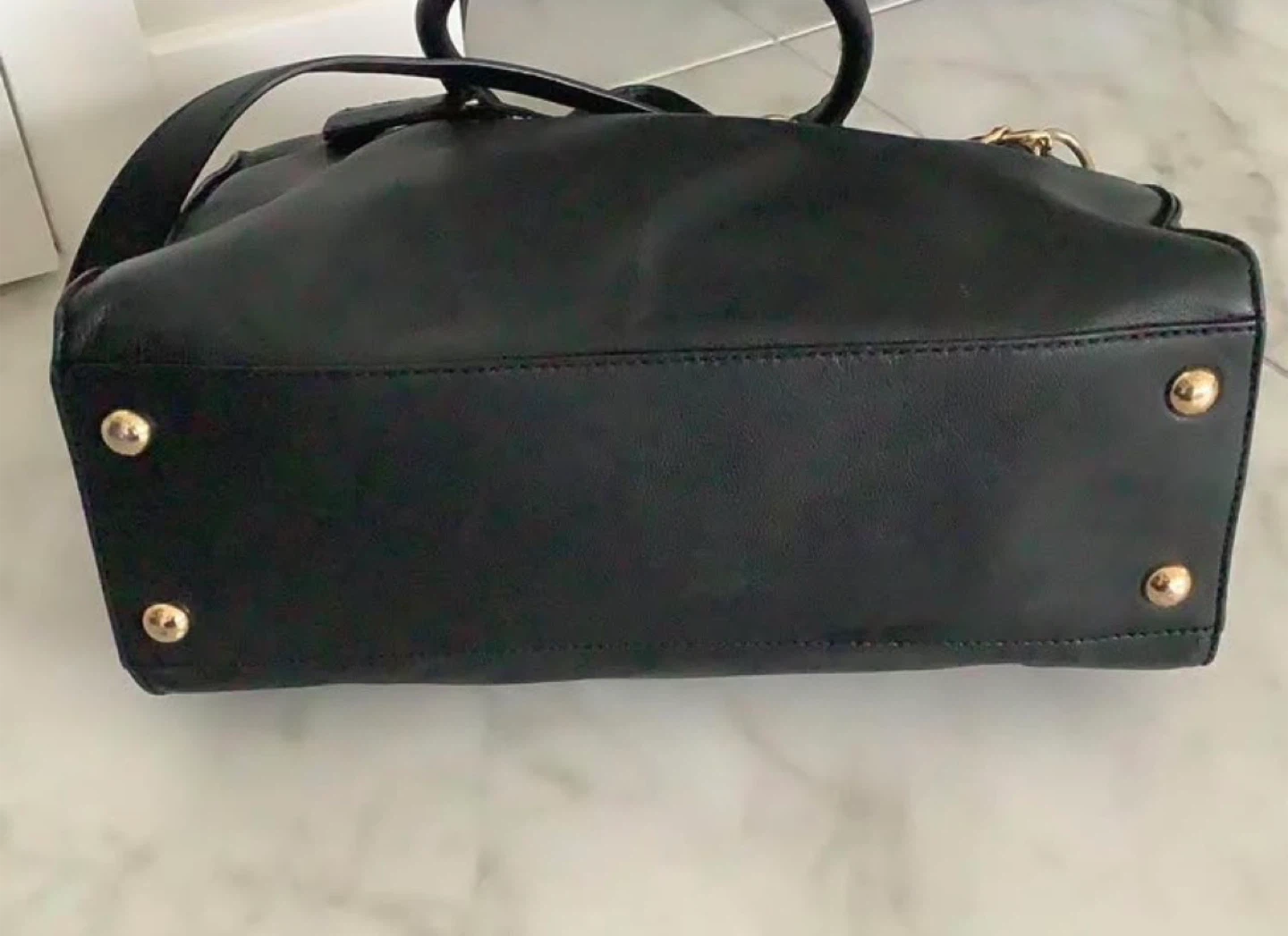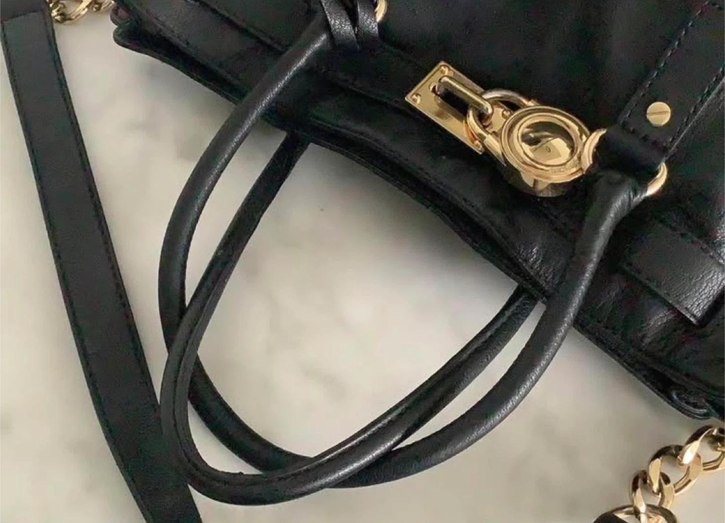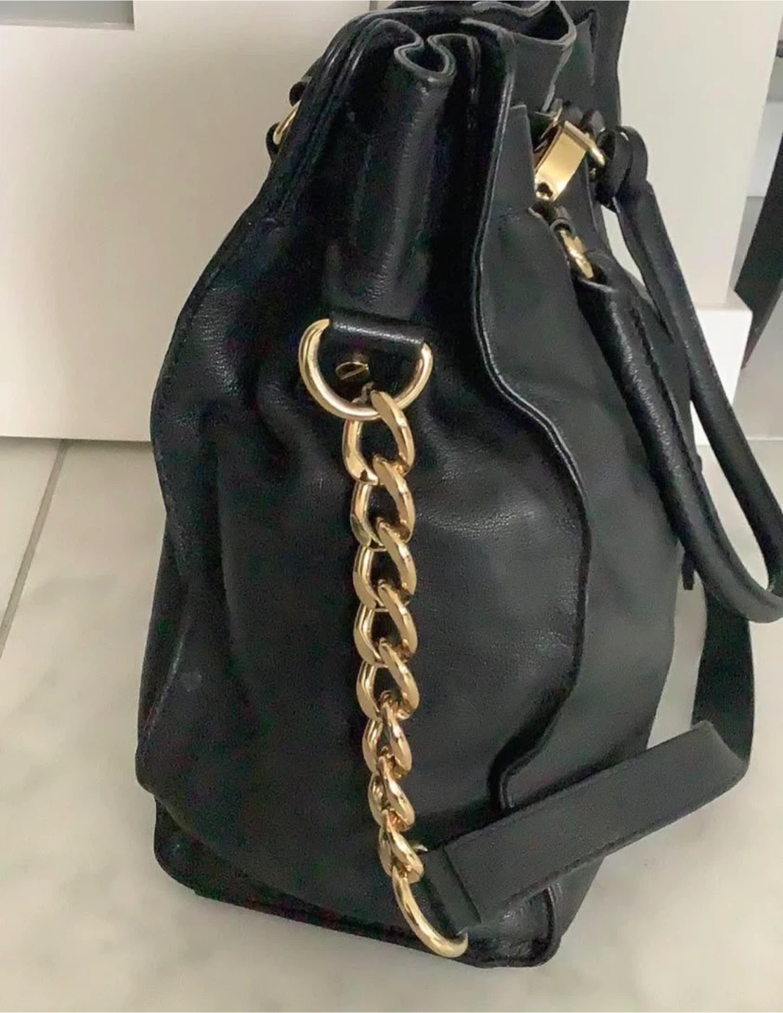 This is an excellent condition Michael Kors black leather bag. It features gold hardware and a chain detail on the side. The bag has a top handle and a removable crossbody strap.