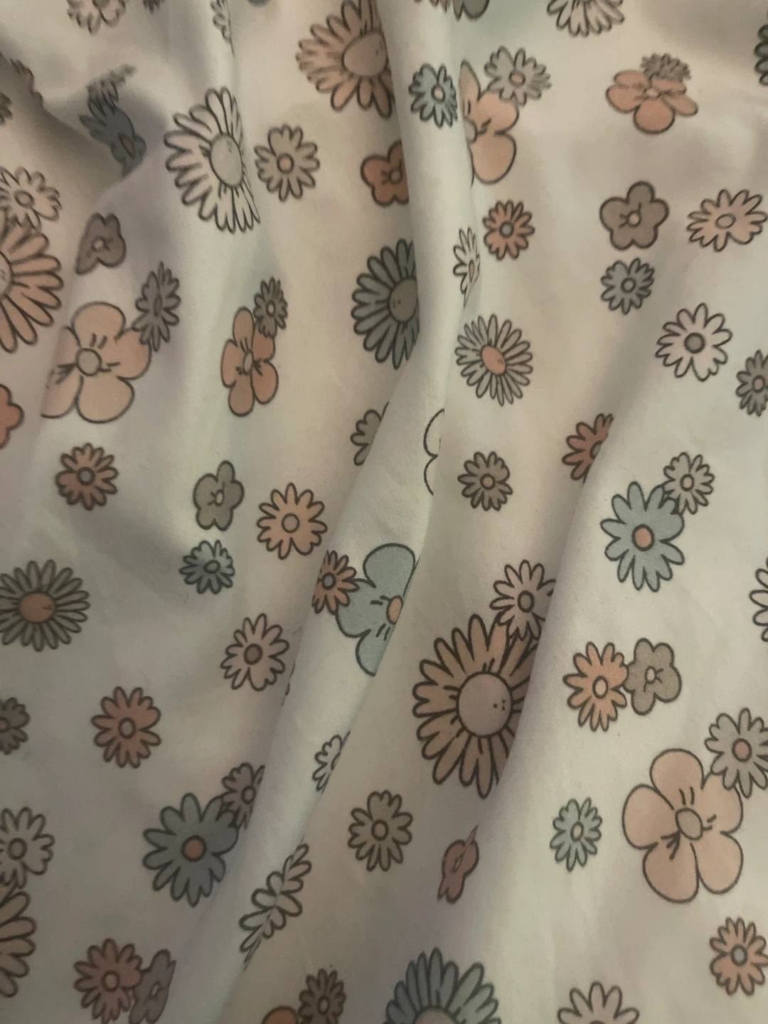 This is a piece of fabric with a cute floral pattern. The flowers are in shades of peach, blue, and gray on a white background. Perfect for your next sewing project!