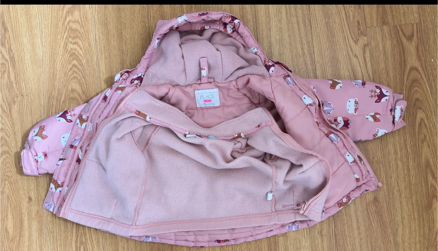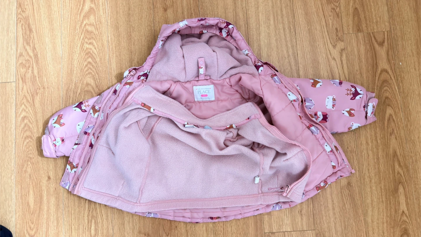 Warm puffer jacket from The Children's Place in a cute pink print.