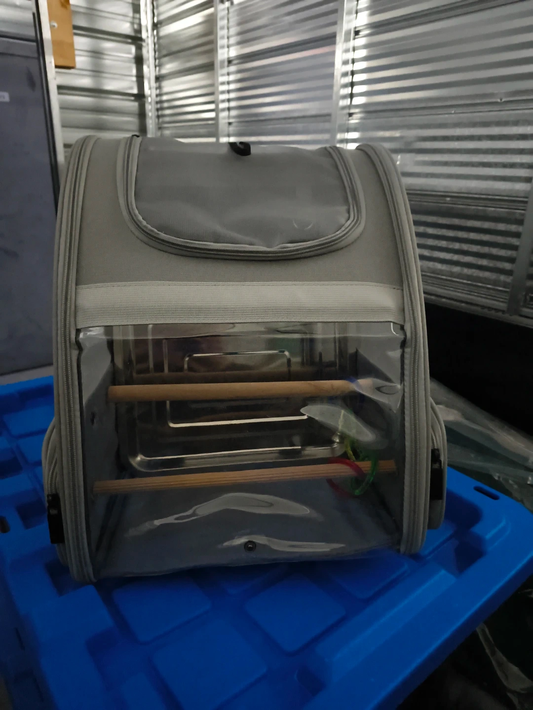 Grey pet carrier backpack for birds. It features multiple mesh windows for ventilation and clear front panels. Includes wooden perches inside for your bird's comfort. Great for travel!