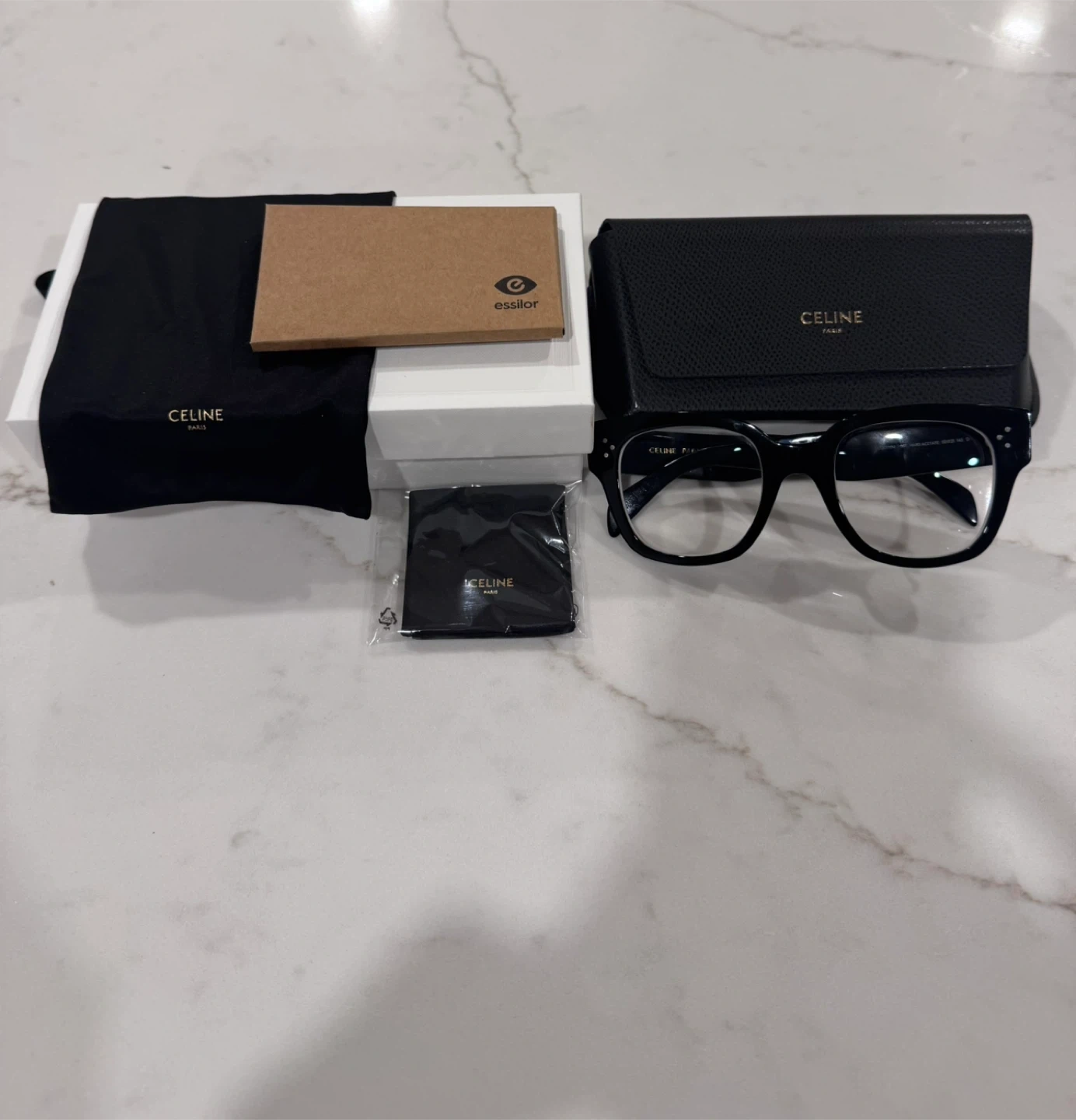 NEW- CELINE Paris eyeglasses in black hard acetate. Model CL50110U, with lens width 52mm, bridge 21mm, and temple length 145mm. Made in Italy. Includes original box, glasses case, dust bag, and cleaning cloth. Does have prescription lenses but not used due to incorrect prescription.