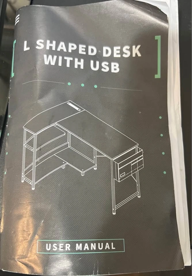 This is a NEW ODK L-shaped computer desk, assembled but missing a few screws. It features built-in power outlets (3) and charging ports (1 USB, 1 Type-C) – perfect for your gaming gear or devices. The reversible design allows you to set up the shelves on either the left or right side to best fit your space. It includes two-tier open shelves and a PC stand for ample storage, plus a side storage bag. The sturdy metal frame and MDF board construction ensure durability. Adjustable non-slip foot pads protect your floor and add stability. Dimensions: 31.5" L x 47.2" W x 29.5" H. Pickup is near Fairway Rd / Lackner Blvd in Kitchener.