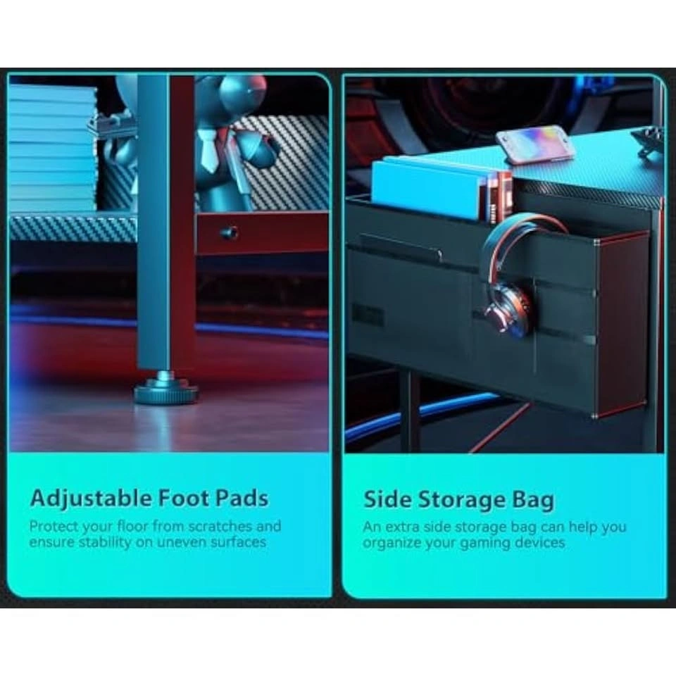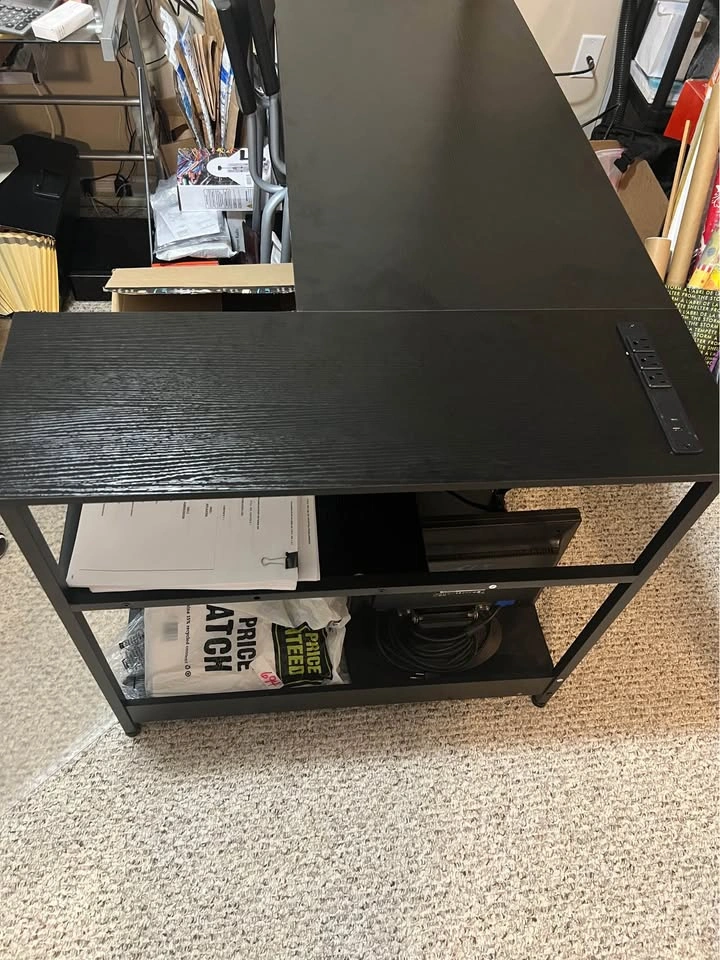 This is a NEW ODK L-shaped computer desk, assembled but missing a few screws. It features built-in power outlets (3) and charging ports (1 USB, 1 Type-C) – perfect for your gaming gear or devices. The reversible design allows you to set up the shelves on either the left or right side to best fit your space. It includes two-tier open shelves and a PC stand for ample storage, plus a side storage bag. The sturdy metal frame and MDF board construction ensure durability. Adjustable non-slip foot pads protect your floor and add stability. Dimensions: 31.5" L x 47.2" W x 29.5" H. Pickup is near Fairway Rd / Lackner Blvd in Kitchener.