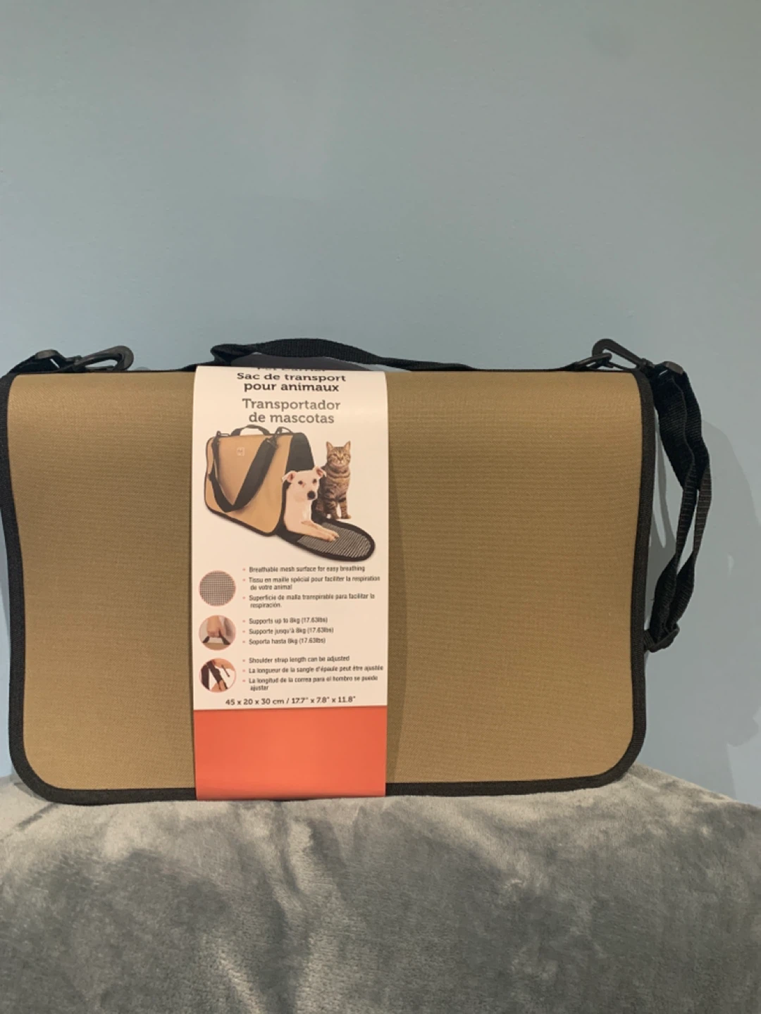 This is a Petstore brand pet carrier bag. It features a breathable mesh surface for easy breathing and supports pets up to 17.6 lbs. The shoulder strap length can be adjusted for comfort. Dimensions are 45 x 20 x 30 cm.