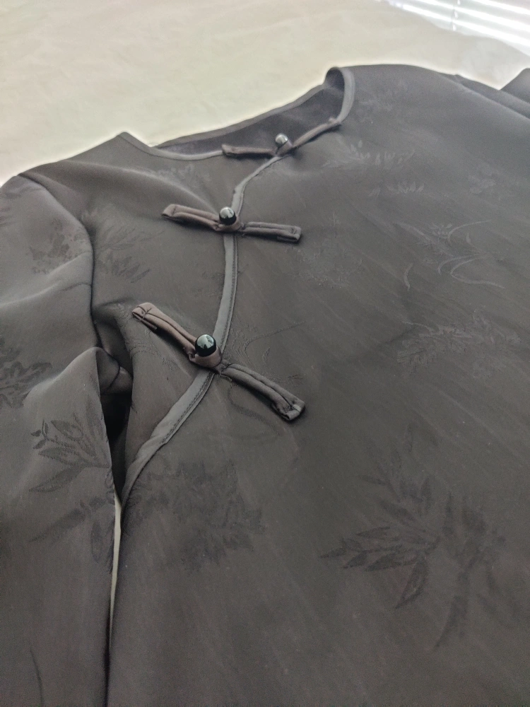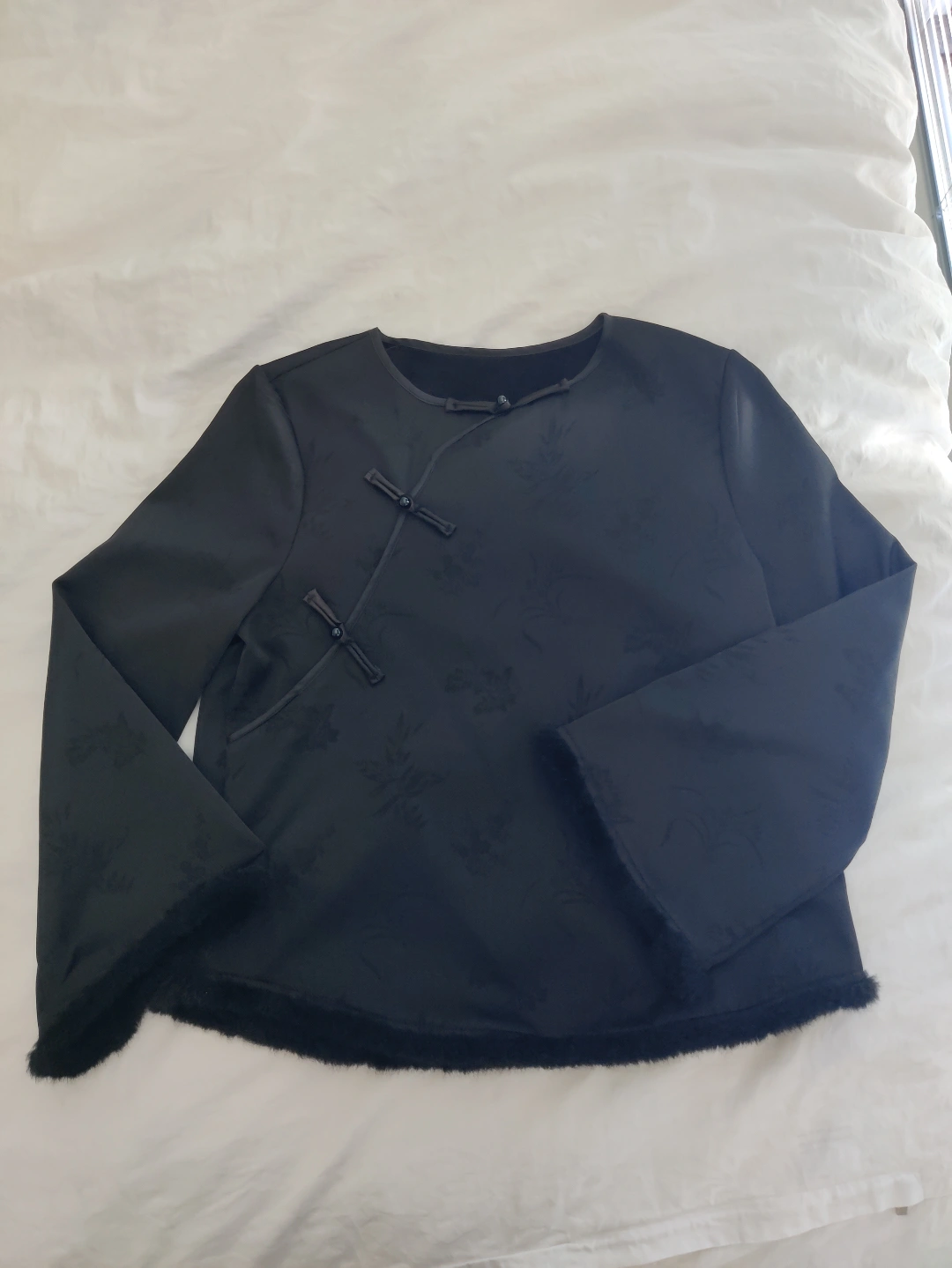 Elegant black fleece top with subtle floral patterns, keep you cozy. Features Chinese stylish toggle closures. New without tag condition. Can fit from S to M.