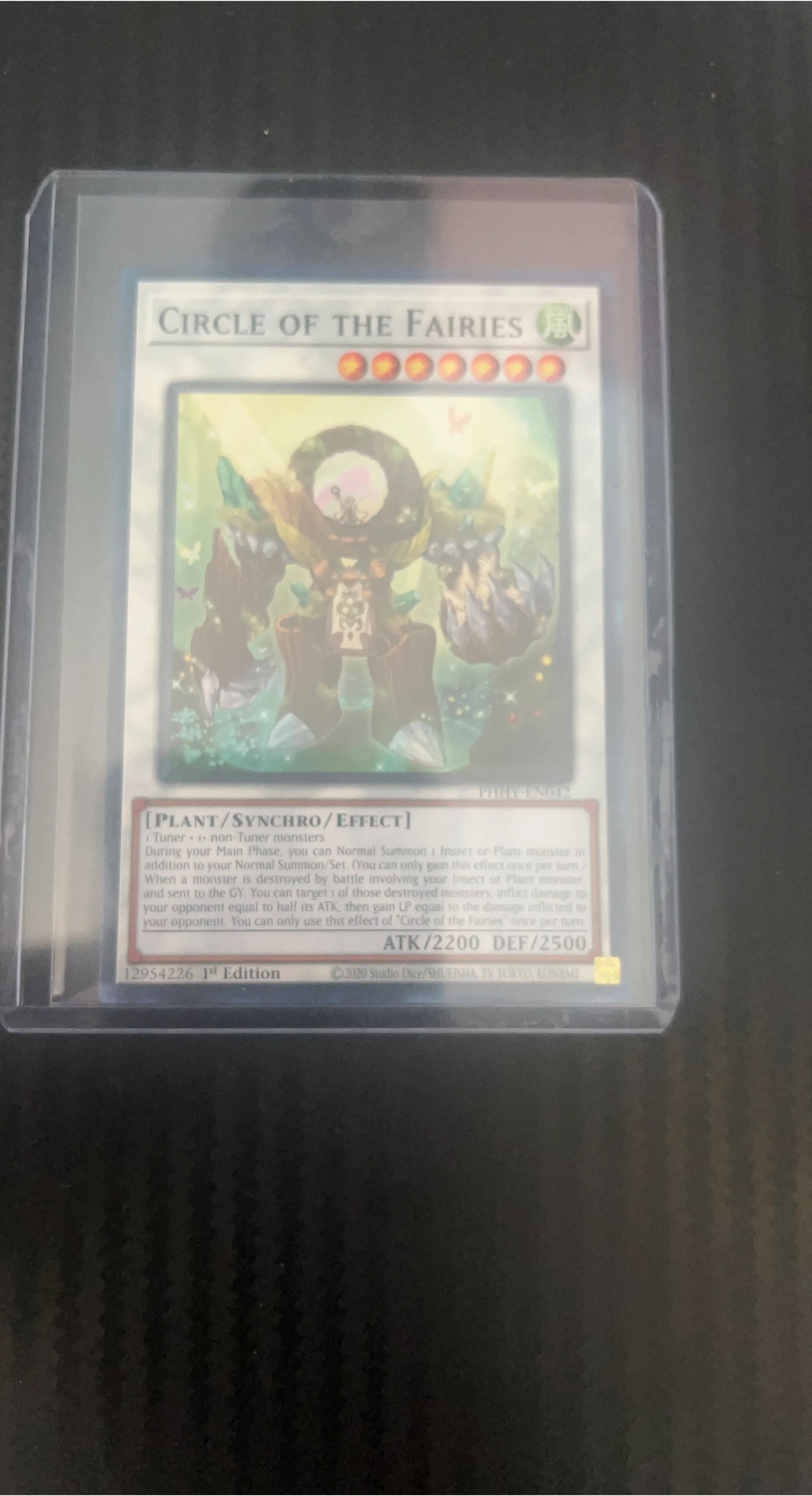 Selling a Circle of the Fairies Yu-Gi-Oh! card. It's a Plant/Synchro/Effect monster with ATK/2200 and DEF/2500. This is a 1st Edition card from 2020.
