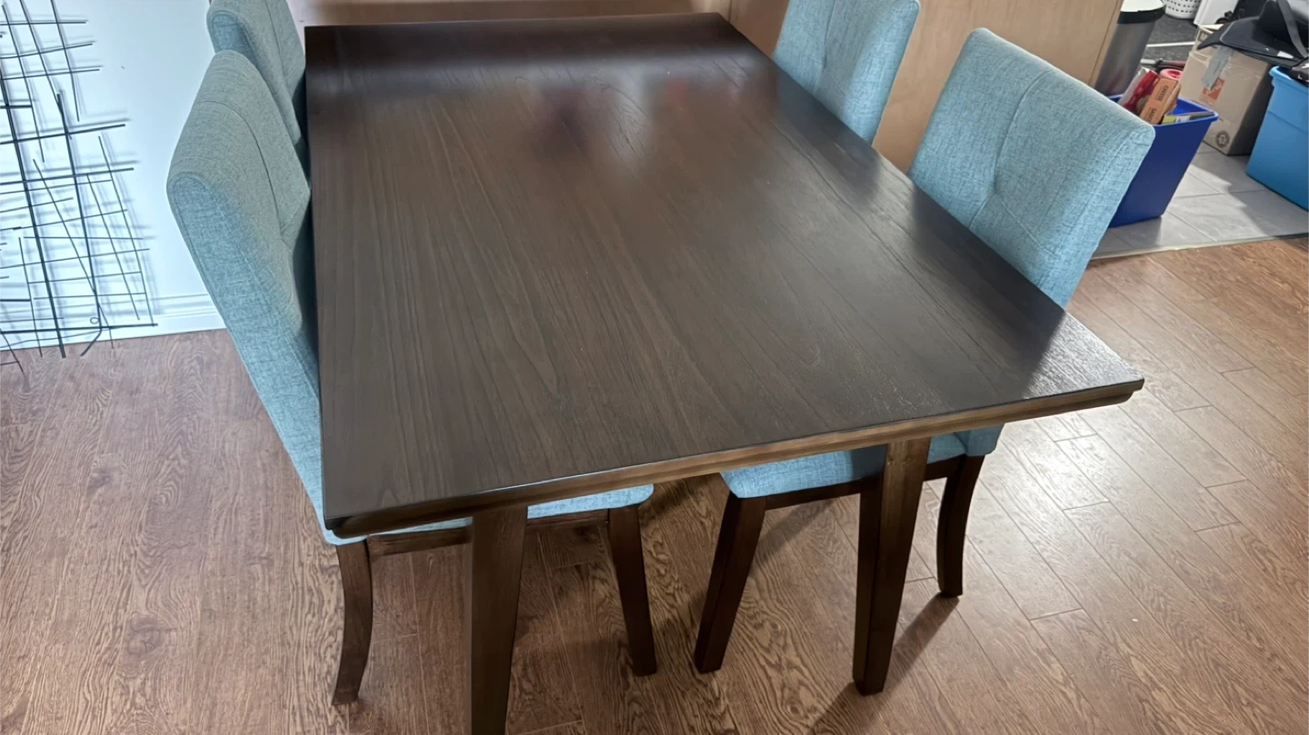 Dark wood finish dining table with four light blue fabric upholstered chairs. Chairs have button-tufted backs and wooden legs. It's a great set for smaller dining spaces.