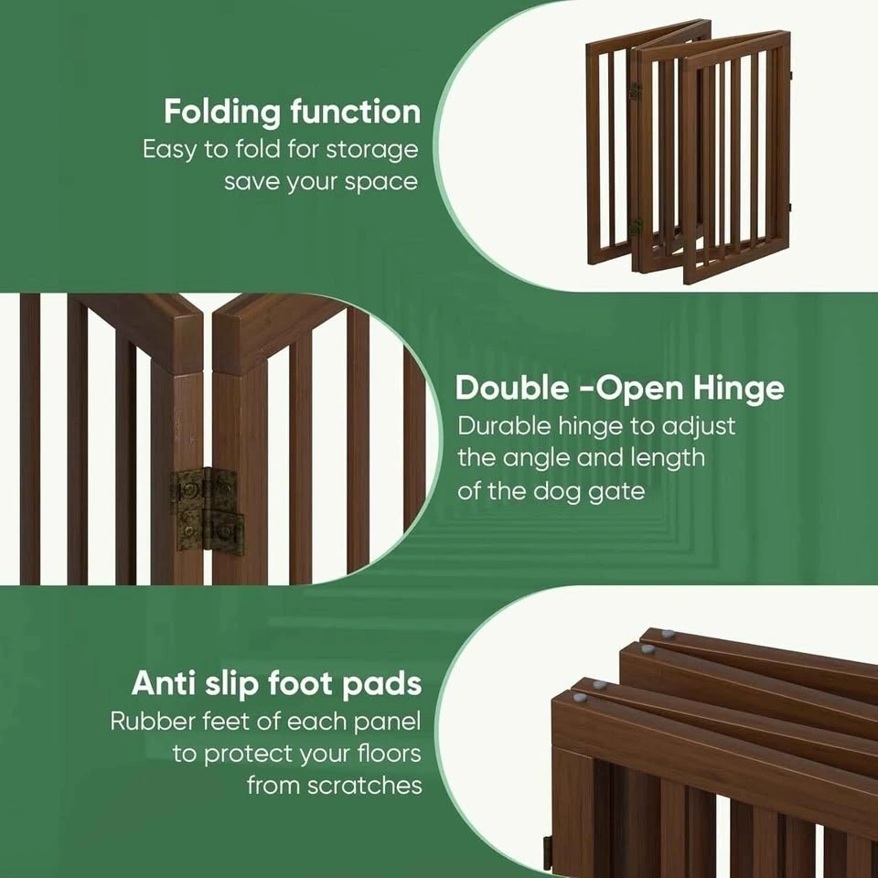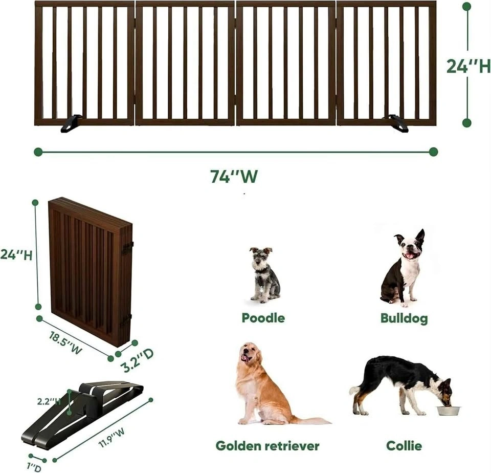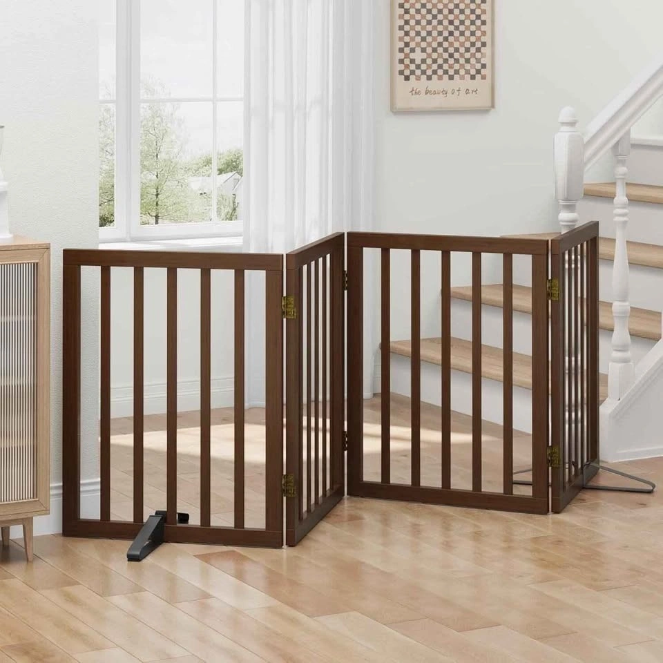 Brand new, 4-panel freestanding dog gate in Dark Walnut. Expands up to 74" wide. Perfect for doorways and open spaces.