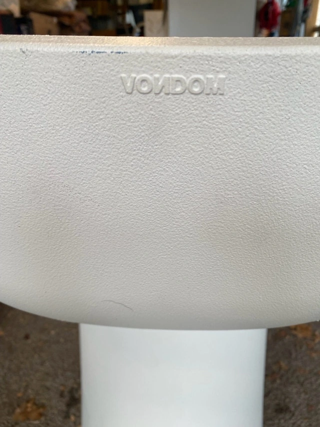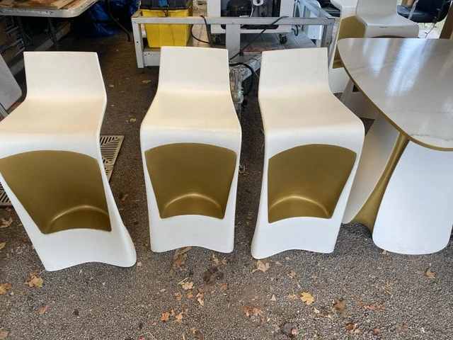 Professionally painted and used in a movie by the film crew. This set includes 5 Vondom bar chairs, 1 bar table, and 2 regular tables. This is high-end furniture made in Spain and can be used as outdoor or indoor furniture. Open to selling or potentially renting.