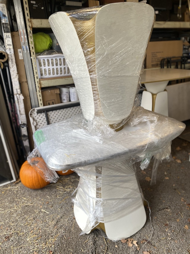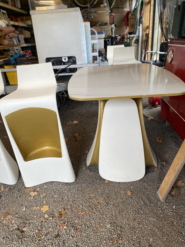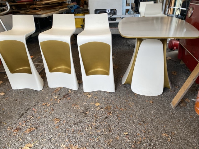 Professionally painted and used in a movie by the film crew. This set includes 5 Vondom bar chairs, 1 bar table, and 2 regular tables. This is high-end furniture made in Spain and can be used as outdoor or indoor furniture. Open to selling or potentially renting.