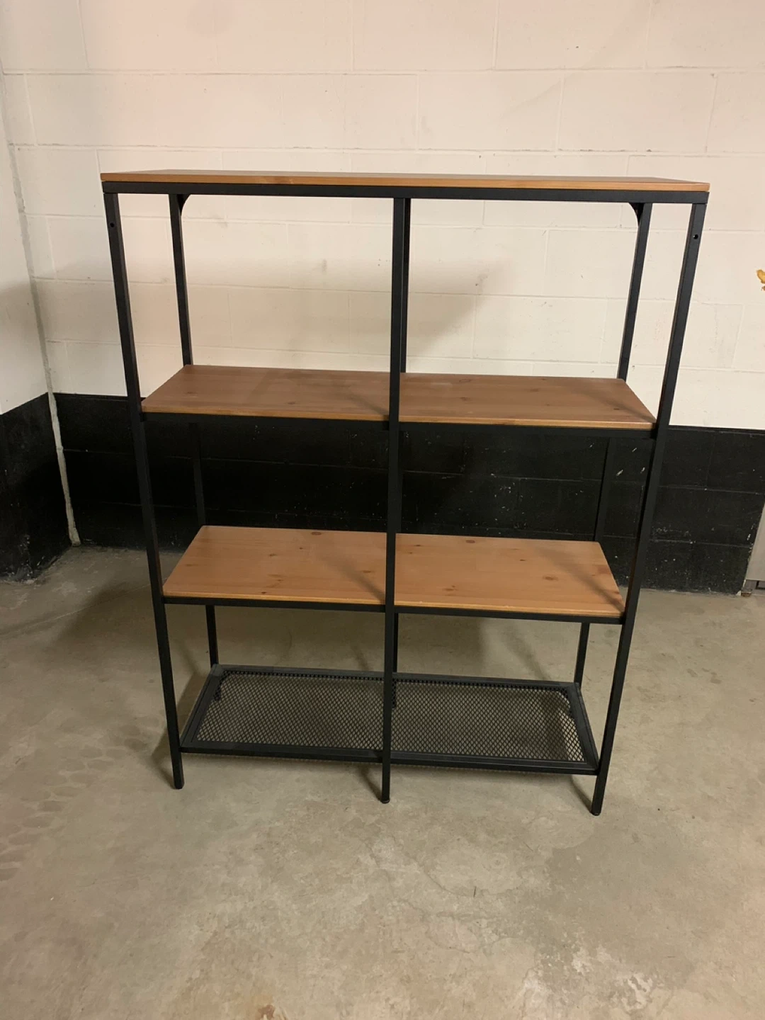 This shelf unit features three wooden shelves and one metal grate shelf. It's made with a black metal frame. Useful for storing books, decor, or plants. Width is 39.5, length is 54 and depth is 14 inches