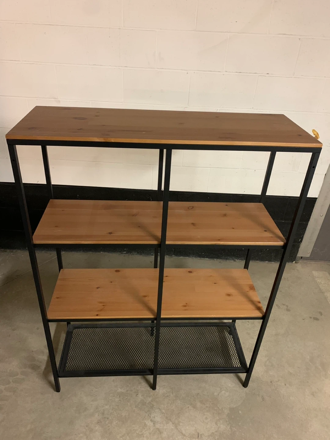 This shelf unit features three wooden shelves and one metal grate shelf. It's made with a black metal frame. Useful for storing books, decor, or plants. Width is 39.5, length is 54 and depth is 14 inches