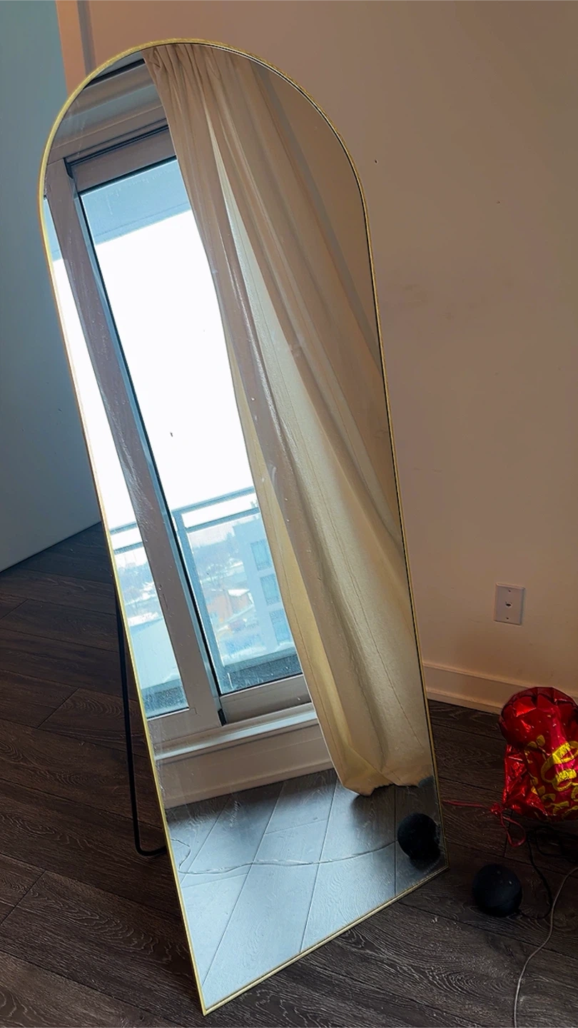 This full-length mirror features a modern arched design with a chic gold-toned frame. It's freestanding and perfect for checking your outfit or adding a decorative touch to your space. The mirror is tall and easily relocatable.