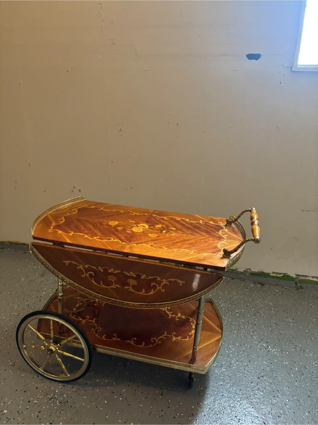 This is a beautiful two-tier bar cart with intricate wood inlay and decorative trim. It features two wheels and a handle for easy mobility. The top surface has a lovely floral inlay design. It's perfect for serving drinks or as a decorative accent piece.