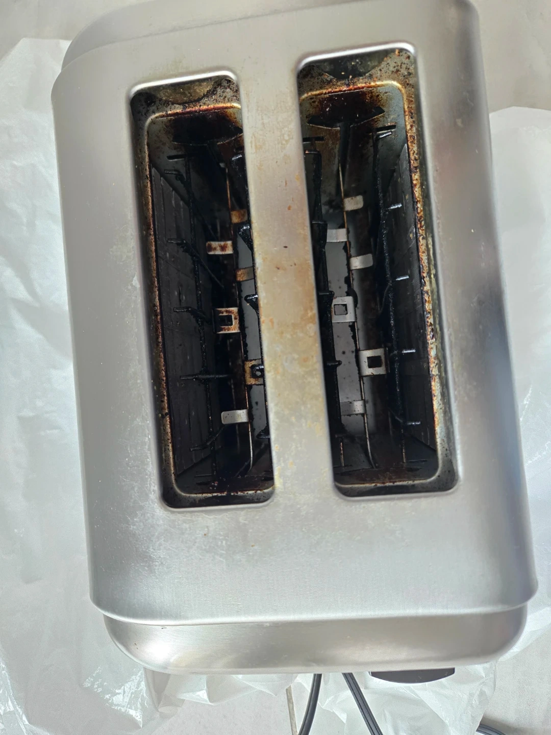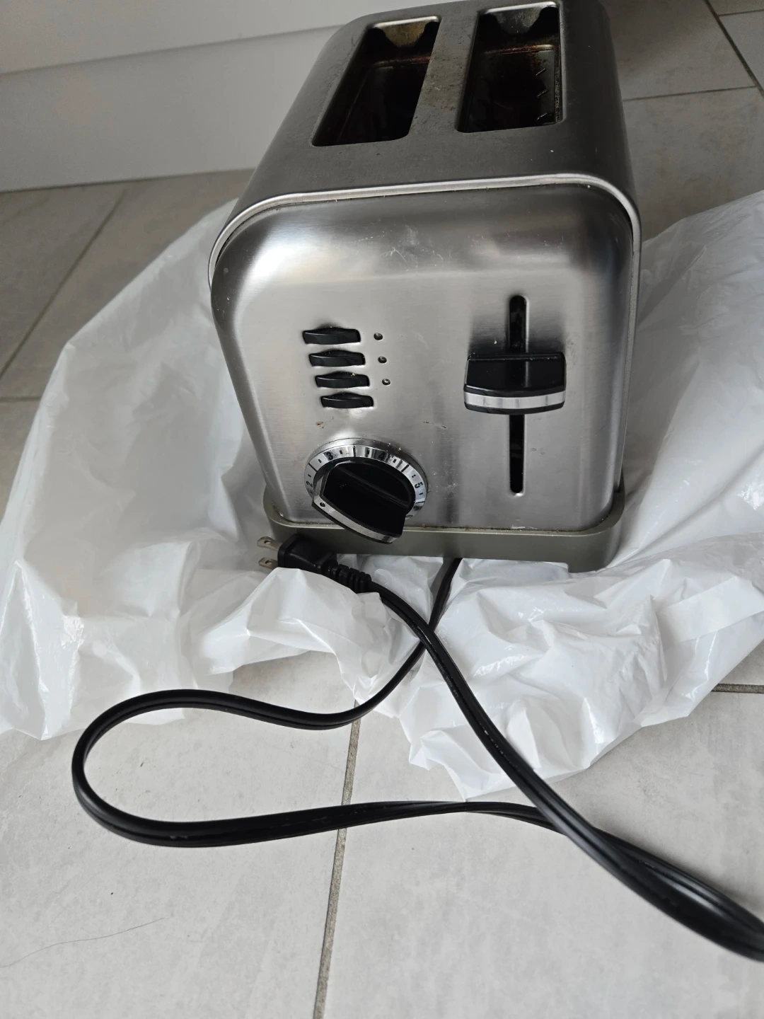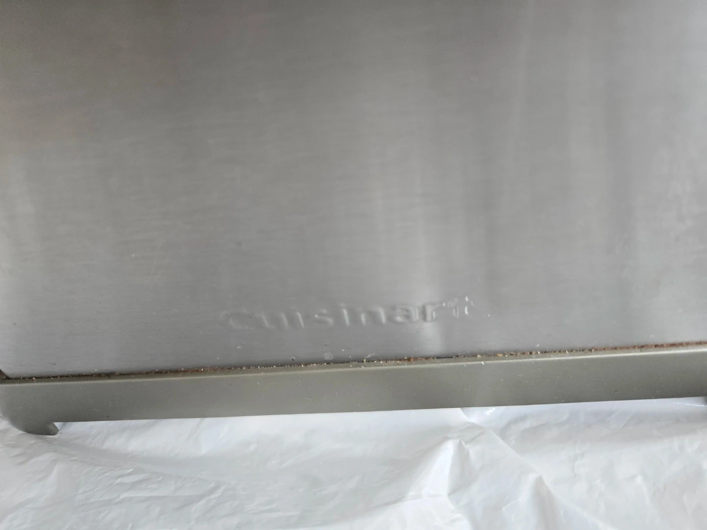 This is a Cuisinart 2-slice toaster. It has a brushed stainless steel exterior. Features a browning control dial and a lever for raising and lowering toast.