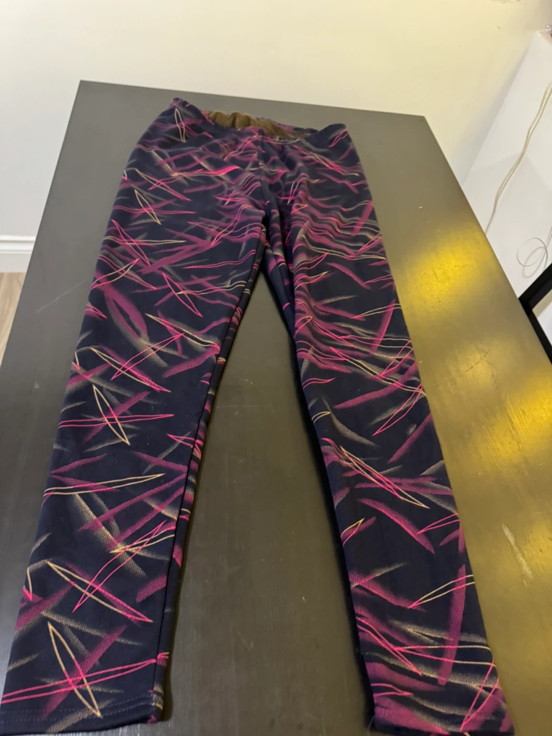 Cozy fleece-lined leggings with a fun abstract print. They're super soft and warm, perfect for staying comfy on chilly days. They feature a comfortable elastic waistband.