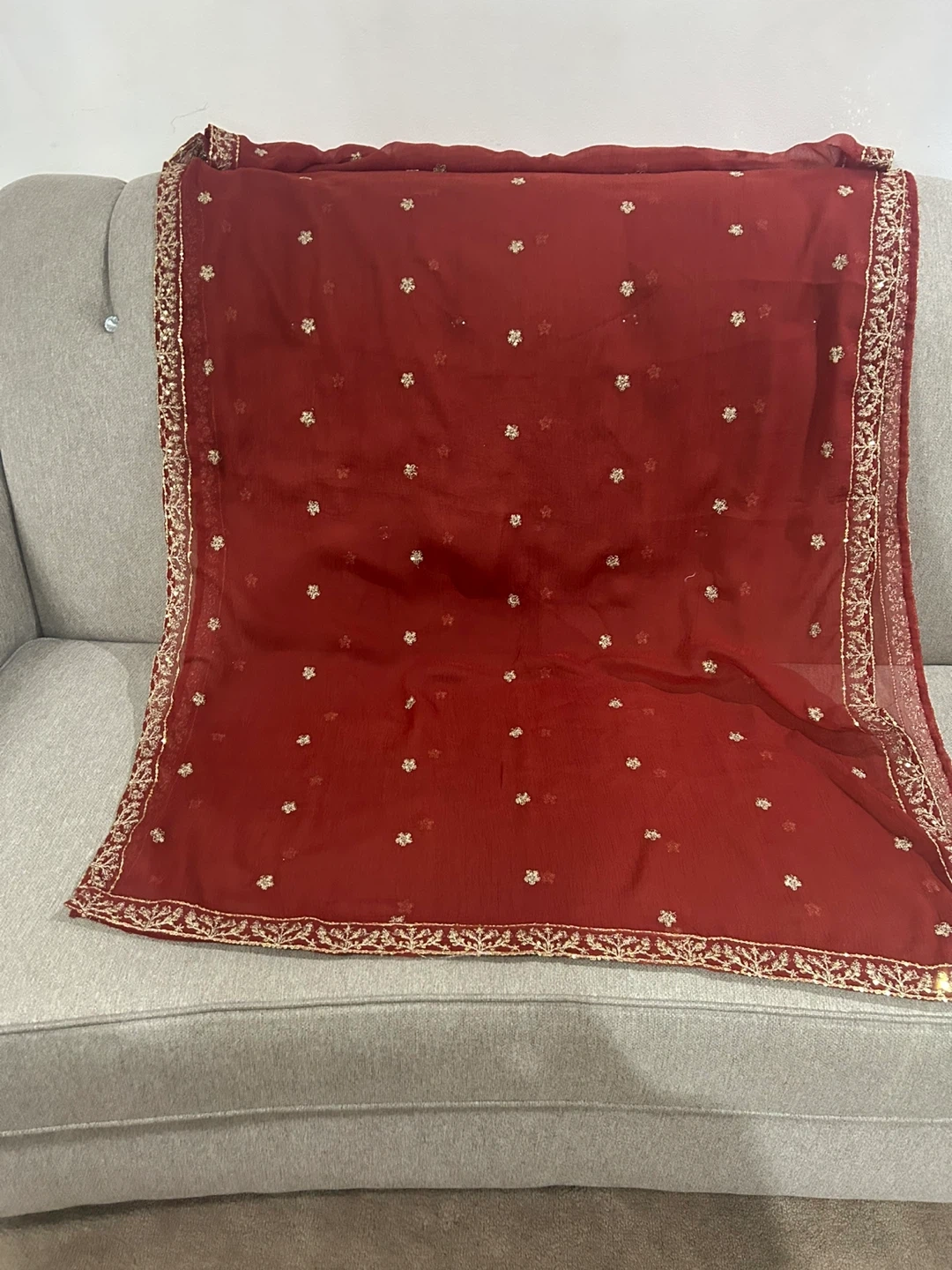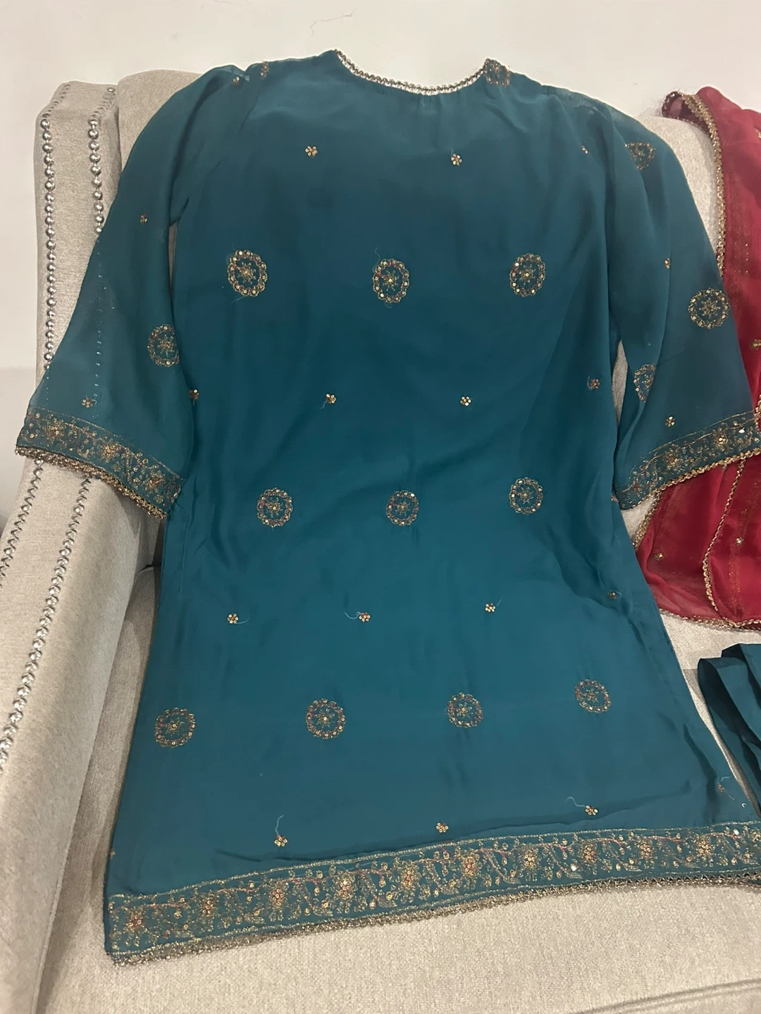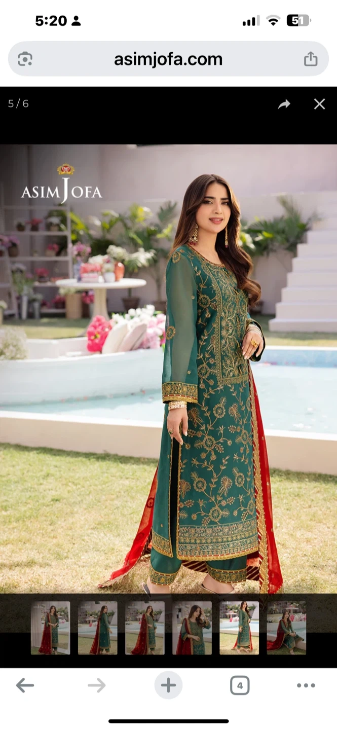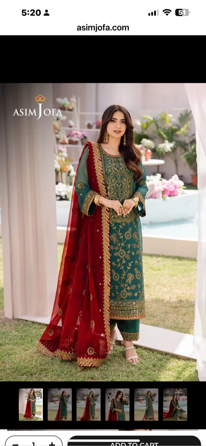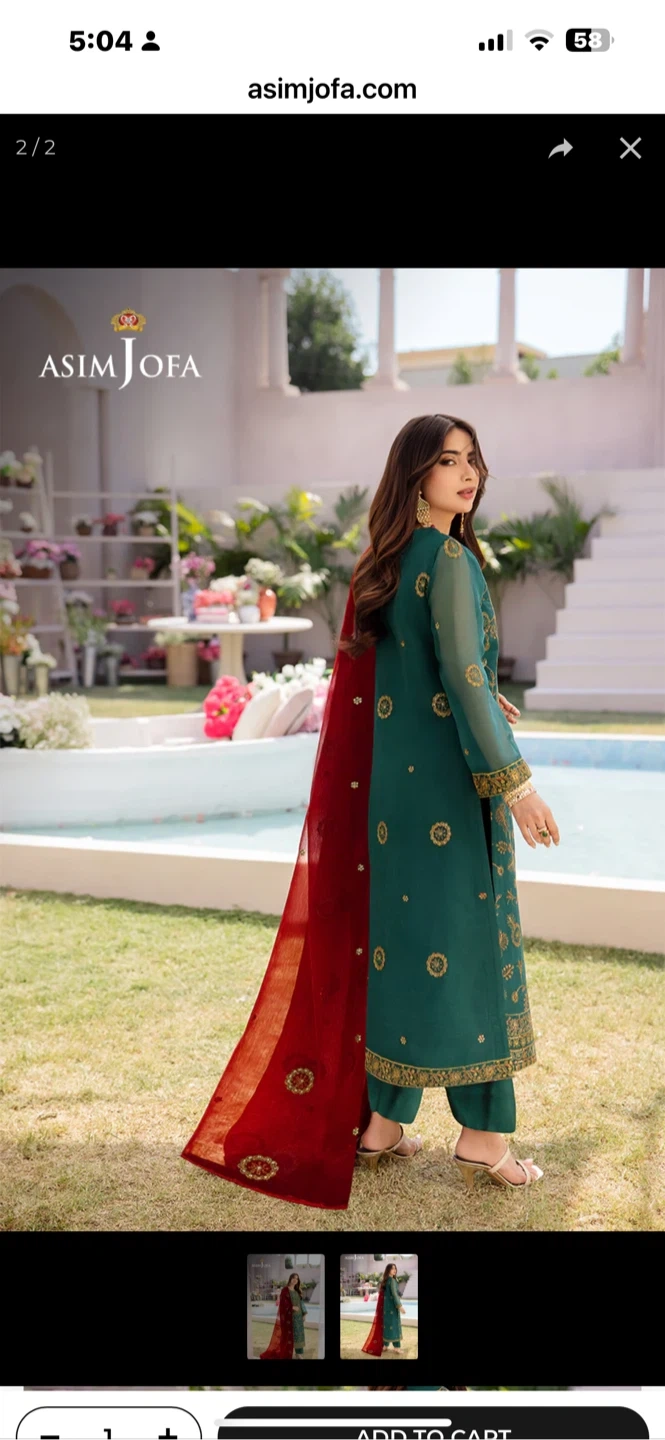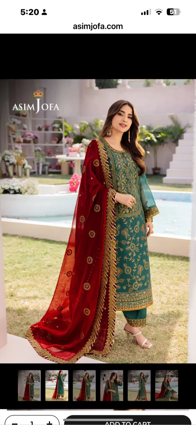 Beautiful teal 3-piece suit from Asim Jofa. It's heavily embroidered with gold thread and sequins, complete with a matching dupatta and trousers. This outfit is perfect for formal occasions and celebrations!