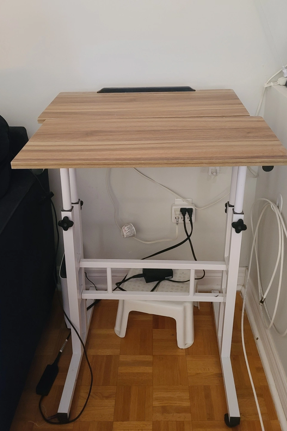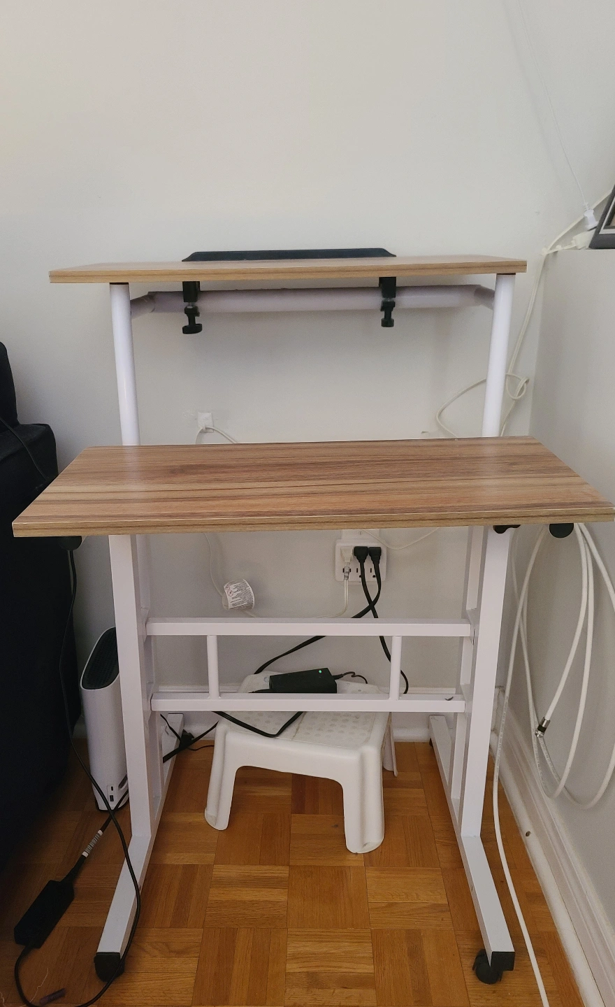 Two-tiered standing desk. White frame, light brown wood top. Adjustable height. Wheels for mobility.