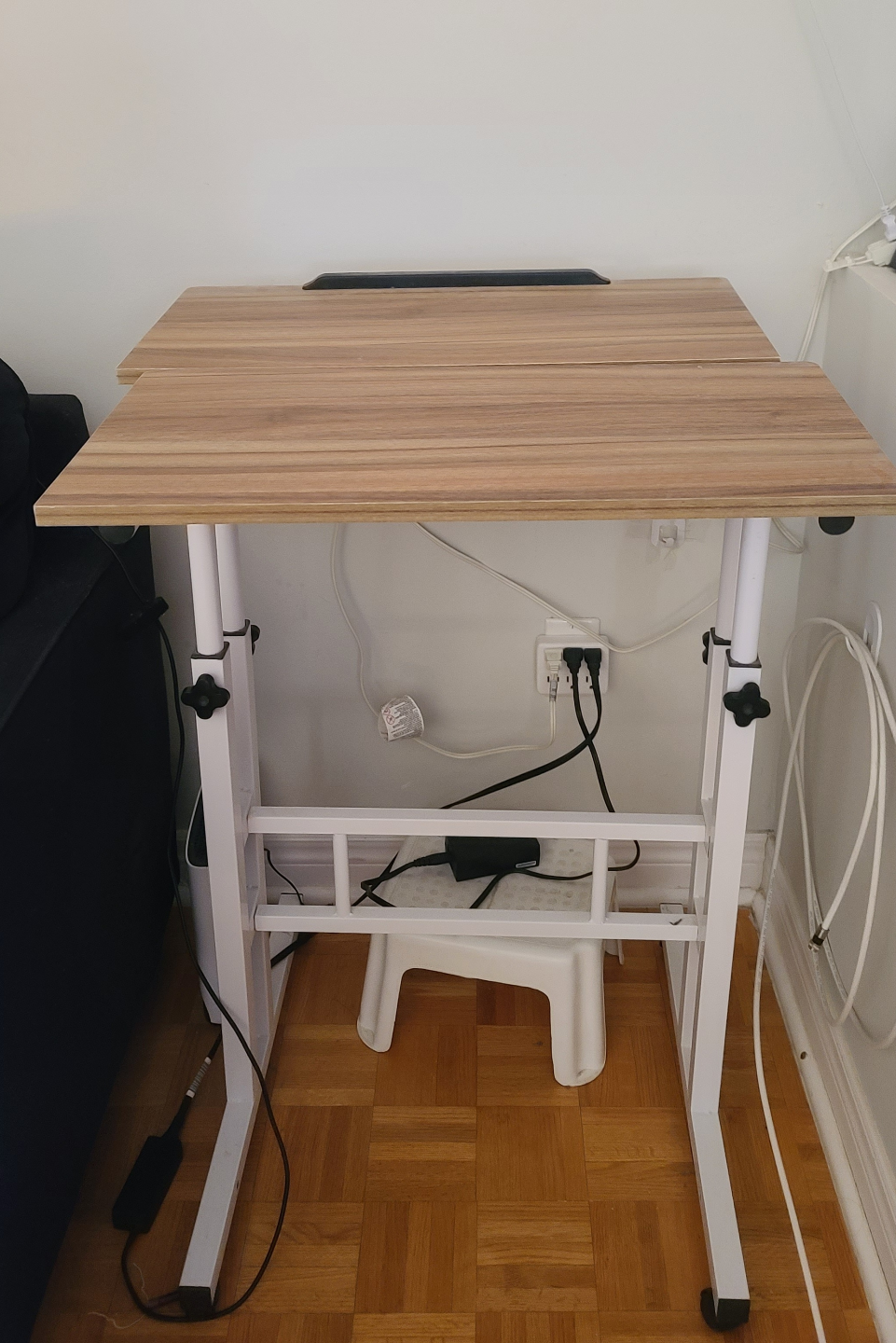 Two-tiered standing desk. White frame, light brown wood top. Adjustable height. Wheels for mobility.