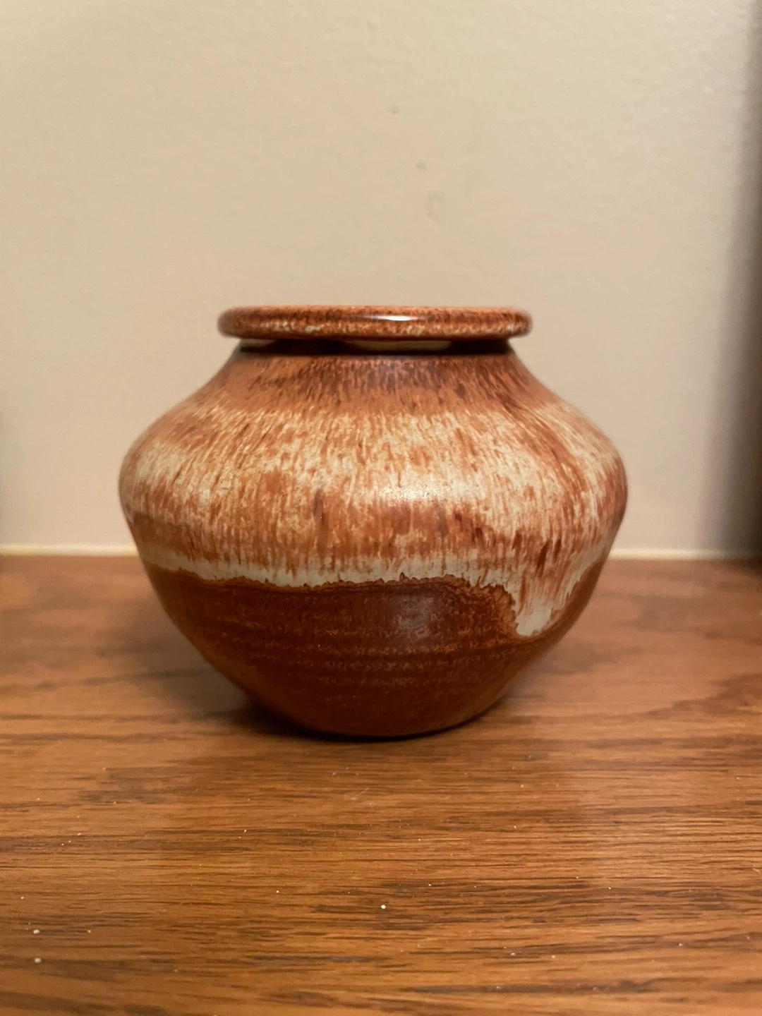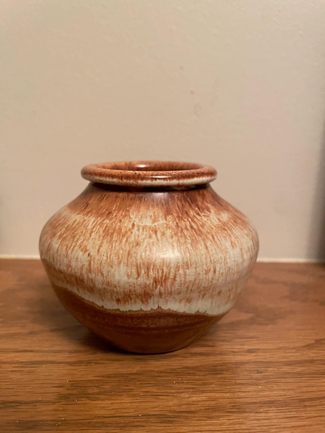 This is a small ceramic vase. It has a glazed finish in brown and white tones. Measures approximately 4 inches tall. It's a nice decorative piece for a shelf or table.