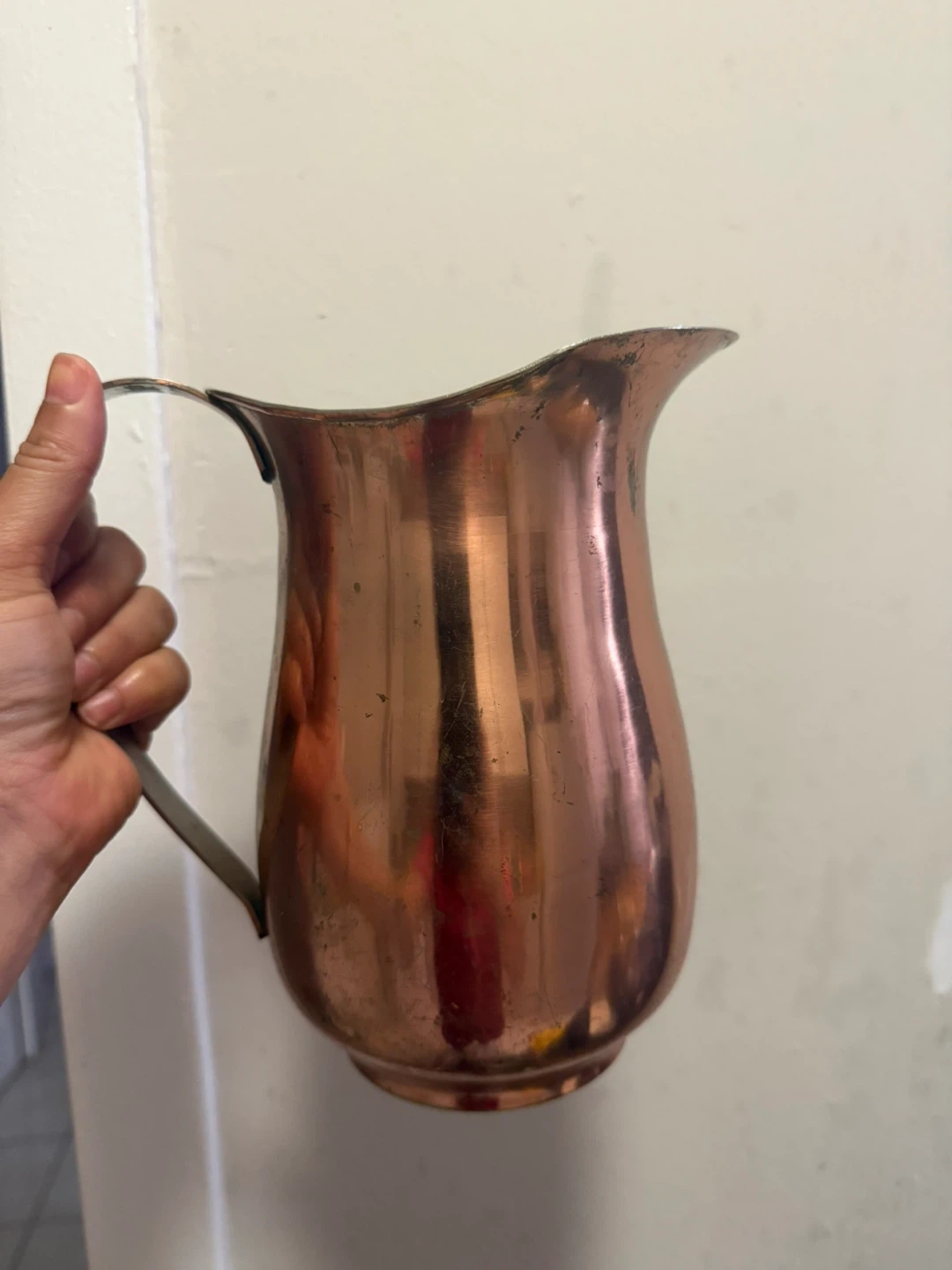 A classic copper pitcher with a sturdy metal handle. It's perfect for serving drinks or as a decorative piece. Shiny copper finish. inside is stainless steel