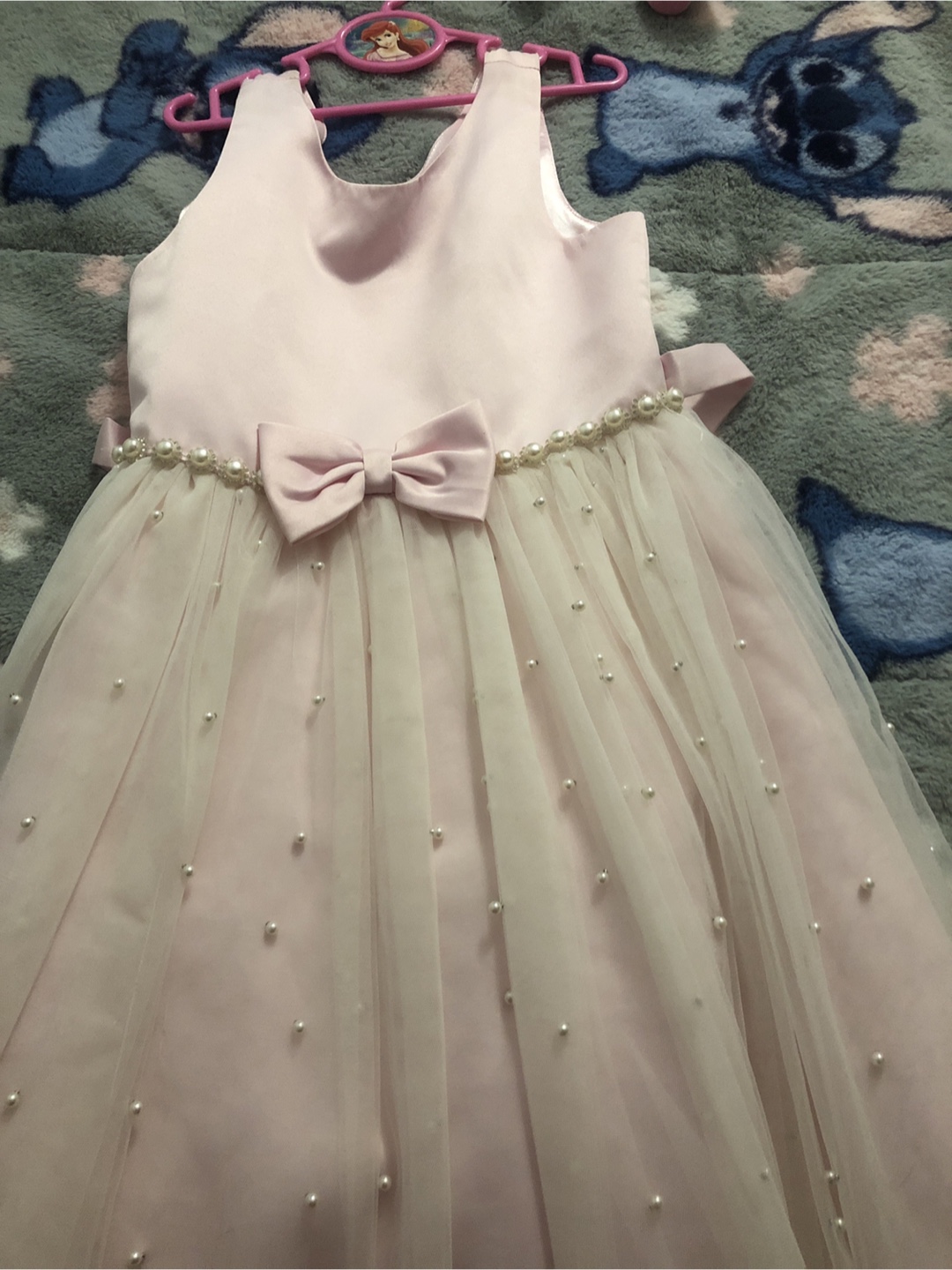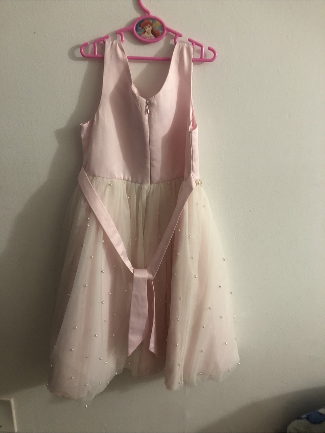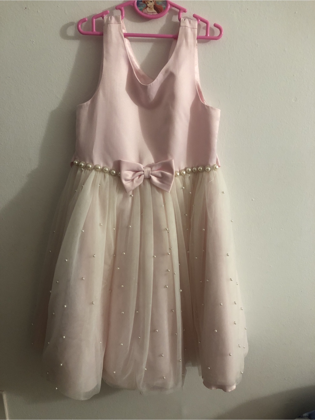 Beautiful pink and beige party dress. Size 10. Features a satin bodice and tulle skirt embellished with pearls. Bow detail at the waist. Perfect for special occasions.