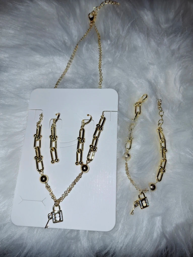 Cute gold-tone jewelry set! Includes a necklace, bracelet, and earrings, all with a lock and key design. Perfect for adding a touch of charm to any outfit