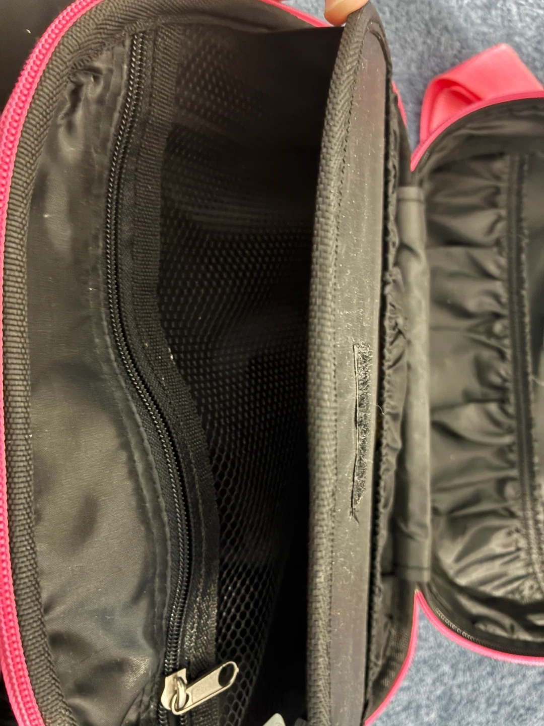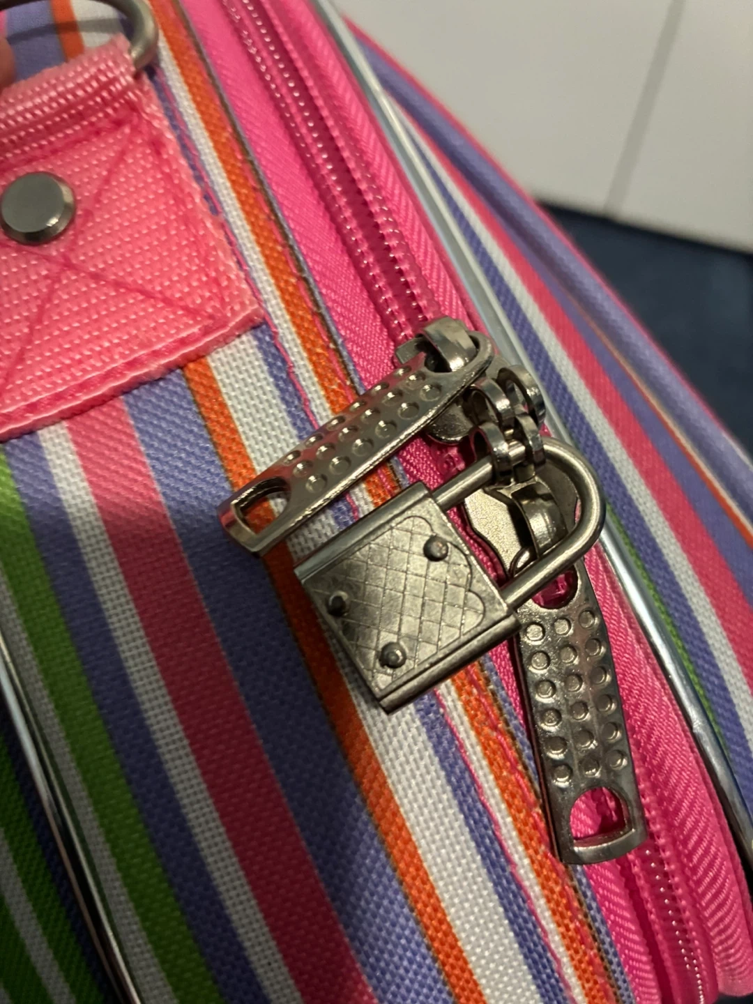 This Luca Vergani train case features a colourful stripe pattern. It has a zippered closure and a removable shoulder strap. Multiple compartments inside keep things organized. This bag is great for travel or storing toiletries. A few marks on the bag seen in photos. Message for meeting or pickup.