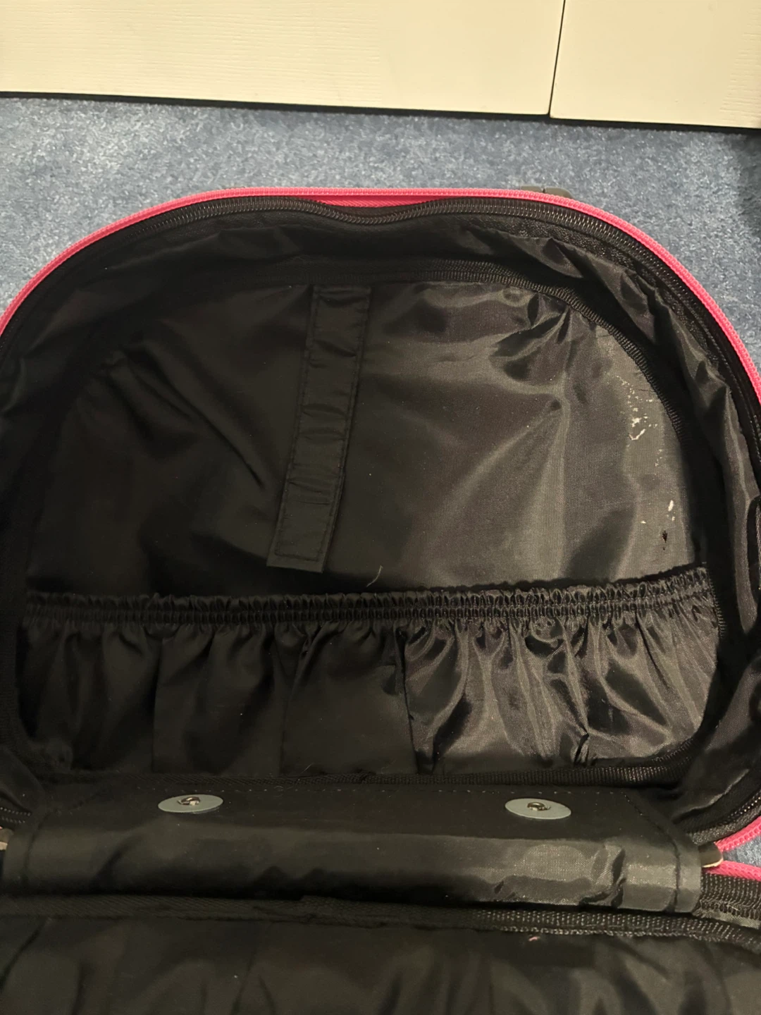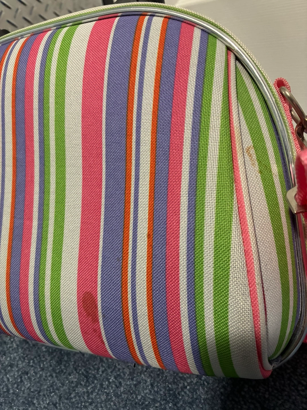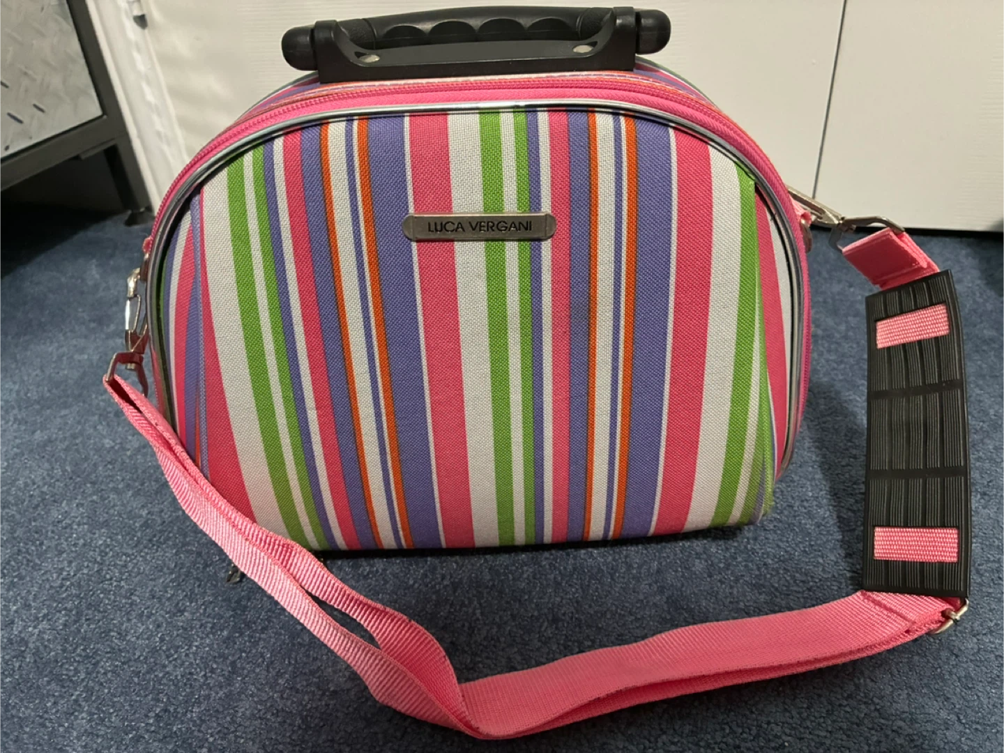 This Luca Vergani train case features a colourful stripe pattern. It has a zippered closure and a removable shoulder strap. Multiple compartments inside keep things organized. This bag is great for travel or storing toiletries. A few marks on the bag seen in photos. Message for meeting or pickup.