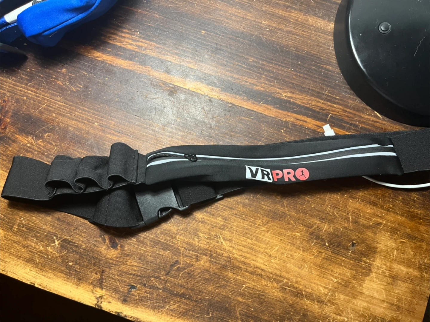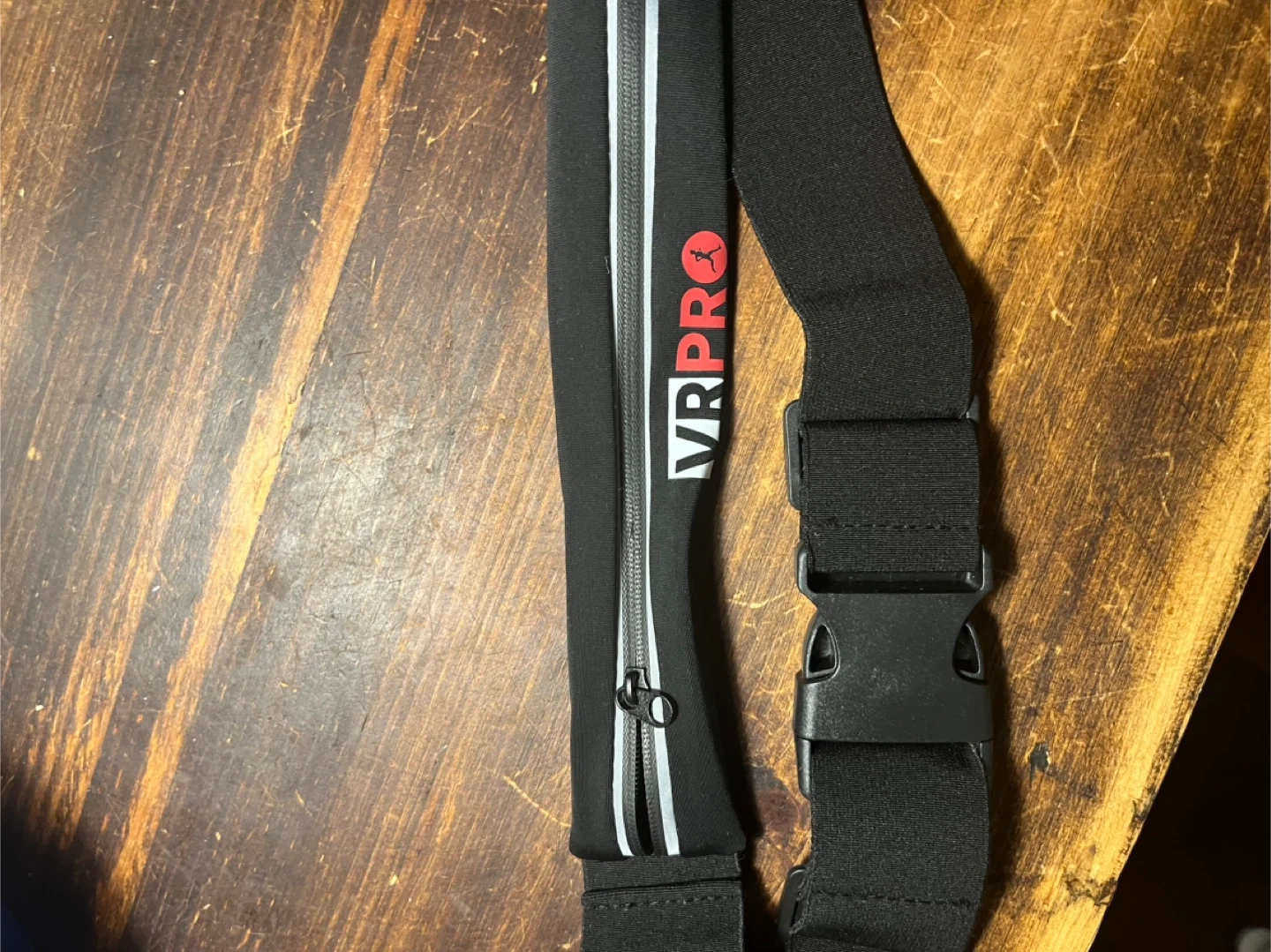 This black running belt is from VRPRO. It features a zippered pocket for securing essentials during your run. The adjustable strap and buckle ensure a comfortable and secure fit. Made with durable material, it's designed for active use.