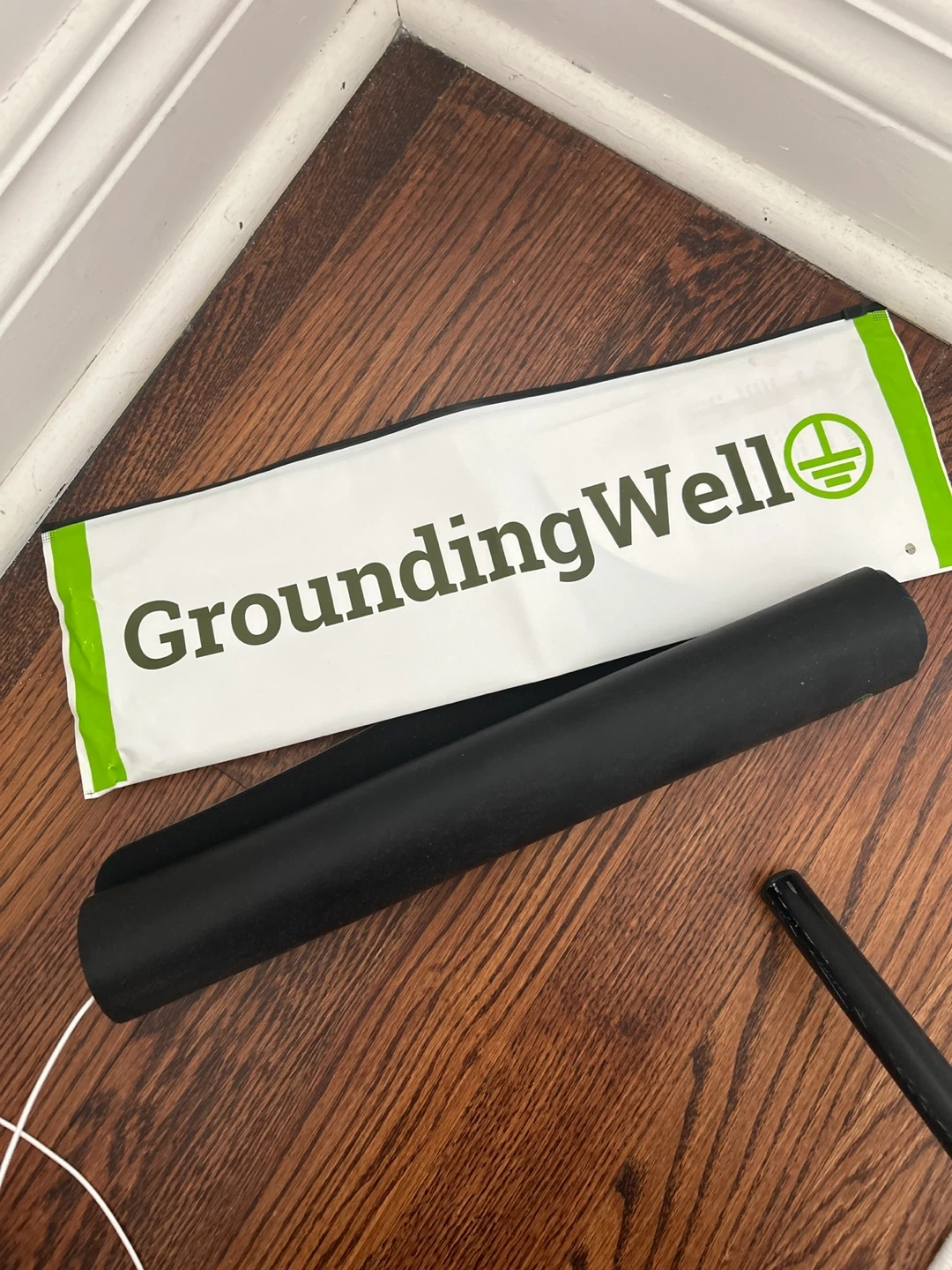 This is a GroundingWell grounding mat with a cable. It's a black mat, likely for personal grounding. Includes the original packaging bag.