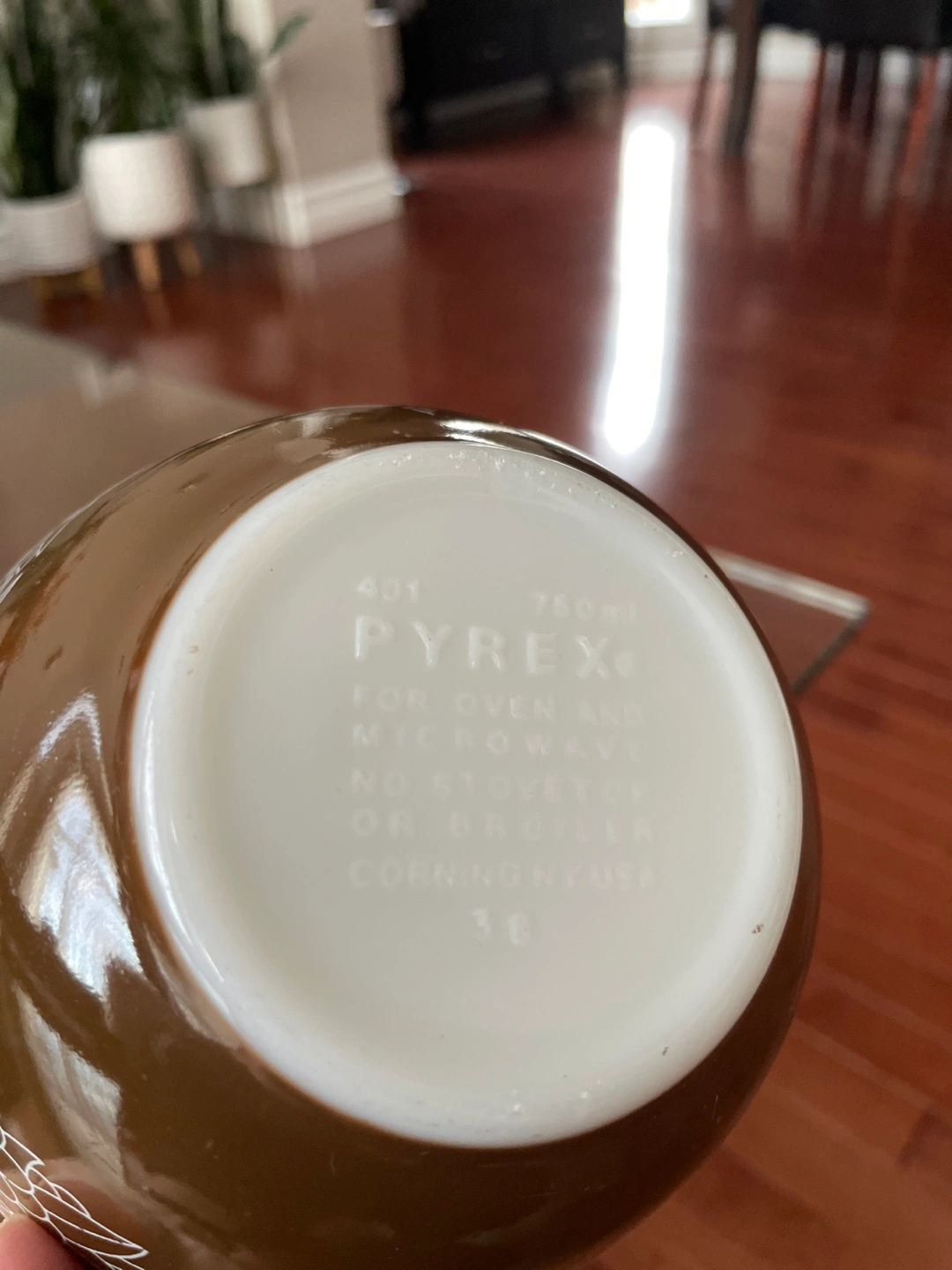 Base is marked "401/ 750ml / PYREX / For Oven and Microwave / No Stovetop or Broiler / Corning, NY, USA"