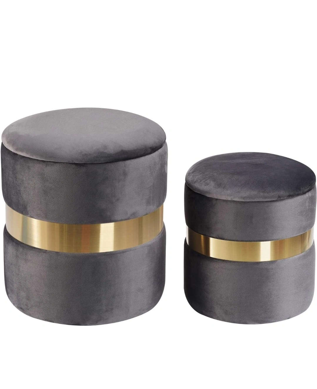 Selling a set of velvet ottomans in gray with a gold accent band. These stylish ottomans also provide internal storage.