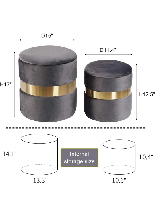 The larger ottoman is 17" tall with a 15" diameter, while the smaller one is 12.5" tall with an 11.4" diameter. They're perfect for adding a touch of elegance and extra storage to any room