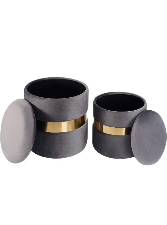 Velvet Ottoman Set with Storage - Gray & Gold