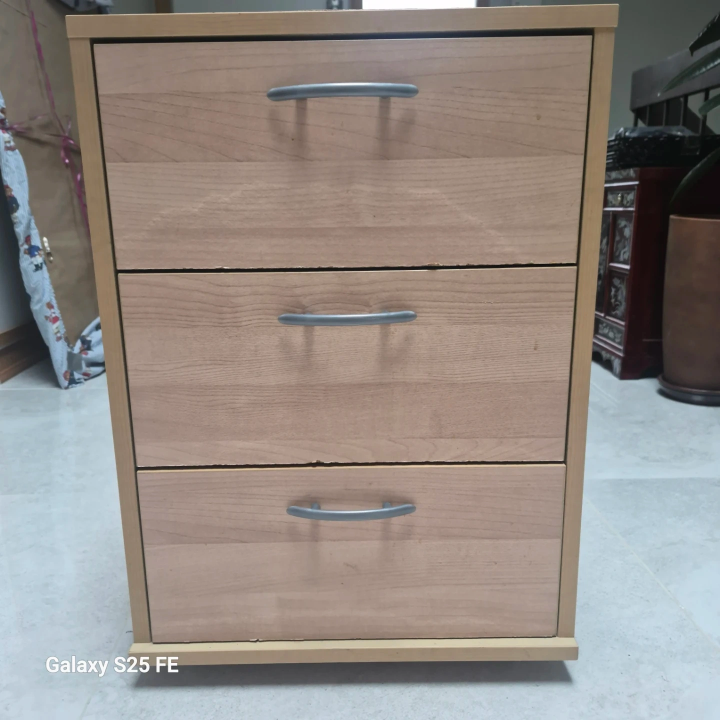 This is a light wood cabinet with three drawers. It's perfect for storing small items. The drawer pulls are silver-toned.