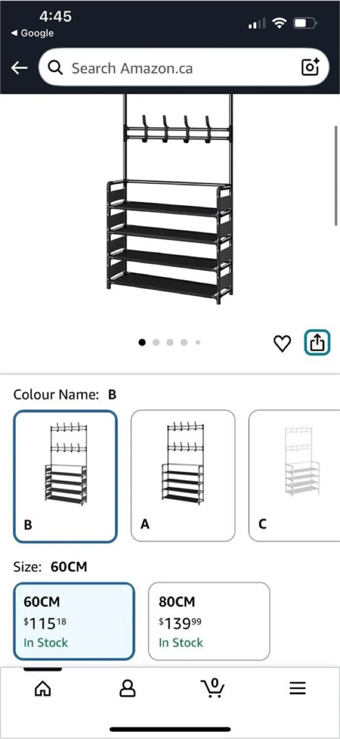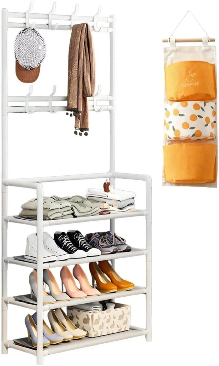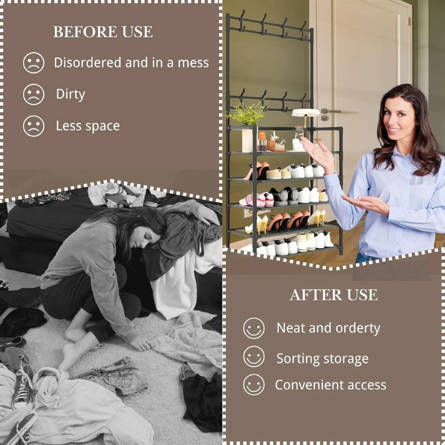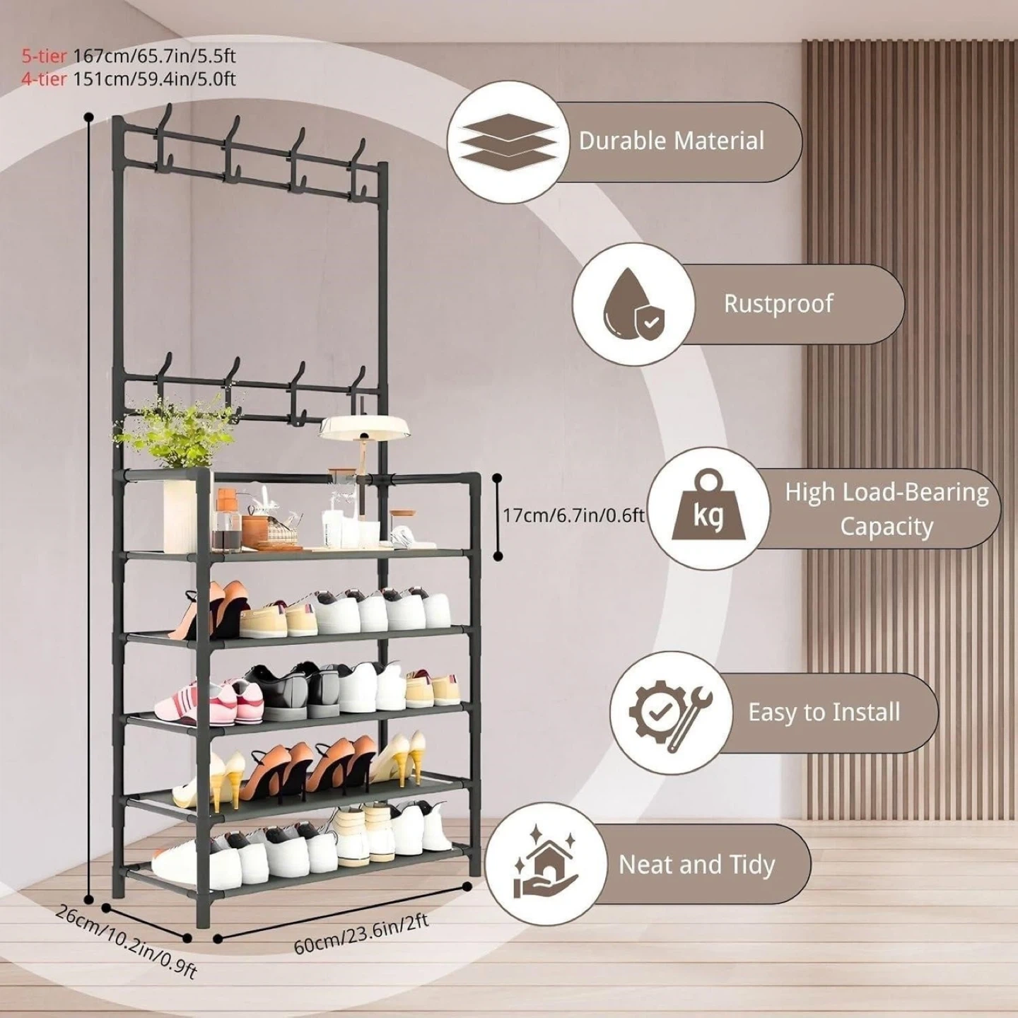 This metal shoe rack features five tiers for storage and an overhead coat rack with hooks. It's rustproof and designed for high load-bearing capacity. Assembly is easy, making it a neat and tidy solution for your entryway or closet.
