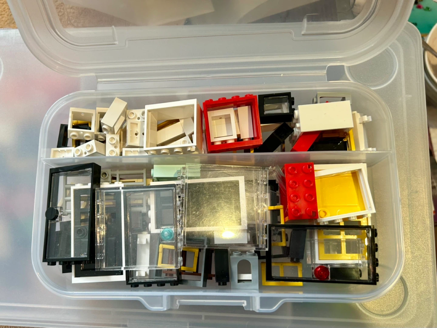 Assorted LEGO window and door building pieces. Includes various sizes and colours like white, black, red, and yellow. Plastic construction.