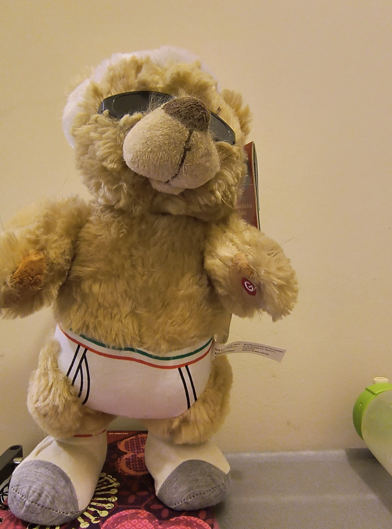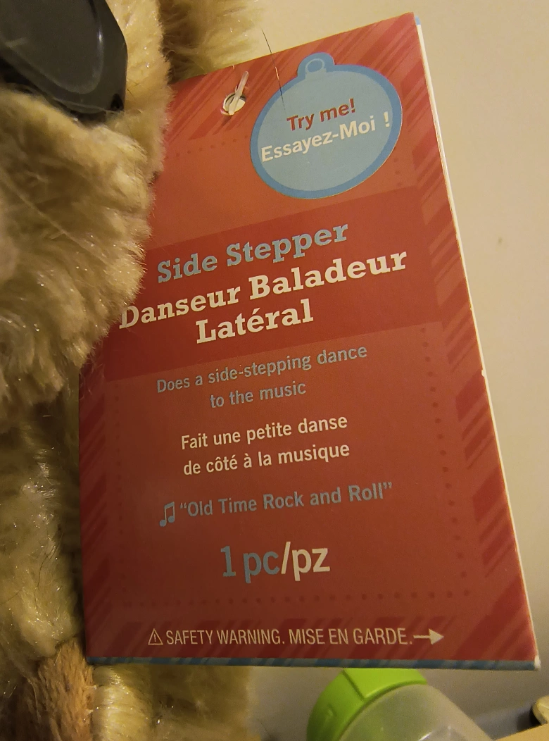 Side-stepping dancing teddy bear with sunglasses and a Santa hat. Plays the song "Old Time Rock and Roll".