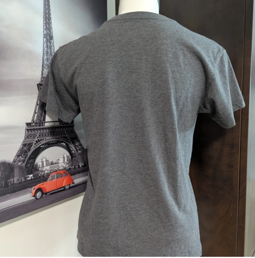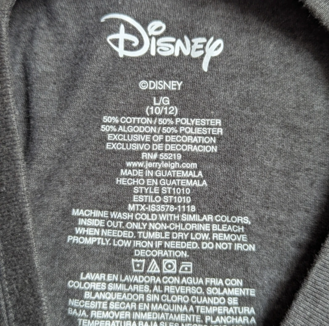 Grey Disney t-shirt featuring Mickey Mouse graphic. It's made of 50% cotton and 50% polyester. Machine wash cold with similar colours, inside out.