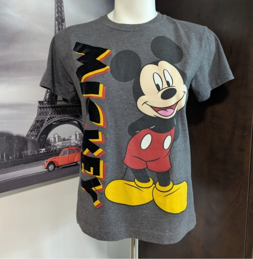 Grey Disney t-shirt featuring Mickey Mouse graphic. It's made of 50% cotton and 50% polyester. Machine wash cold with similar colours, inside out.