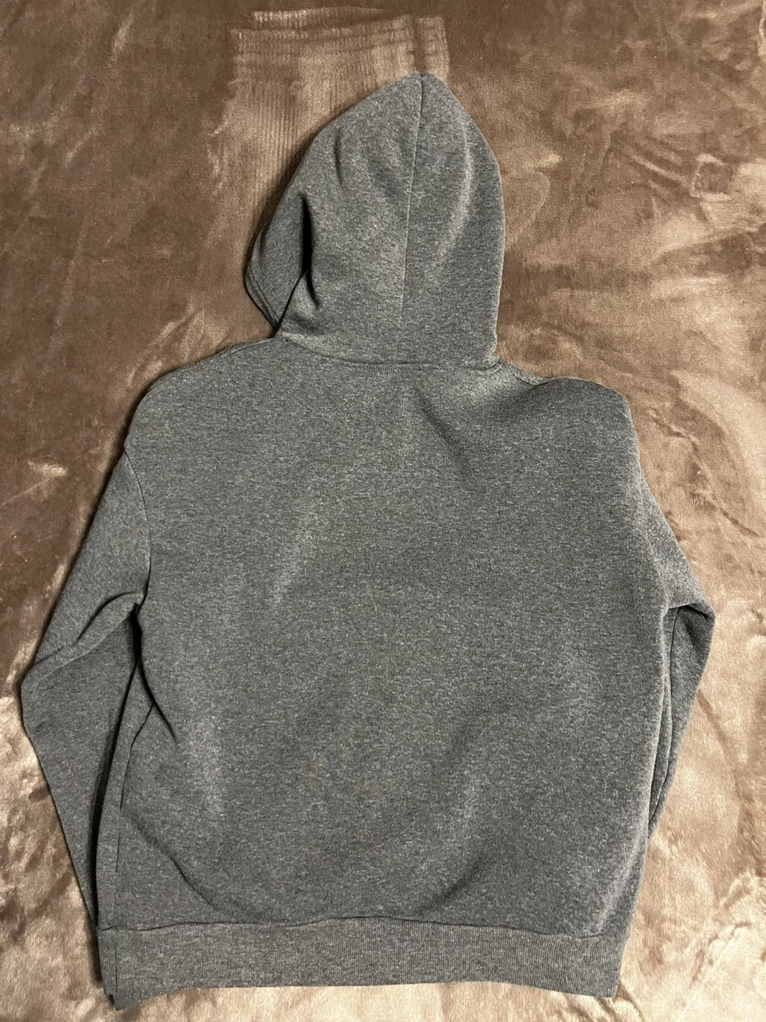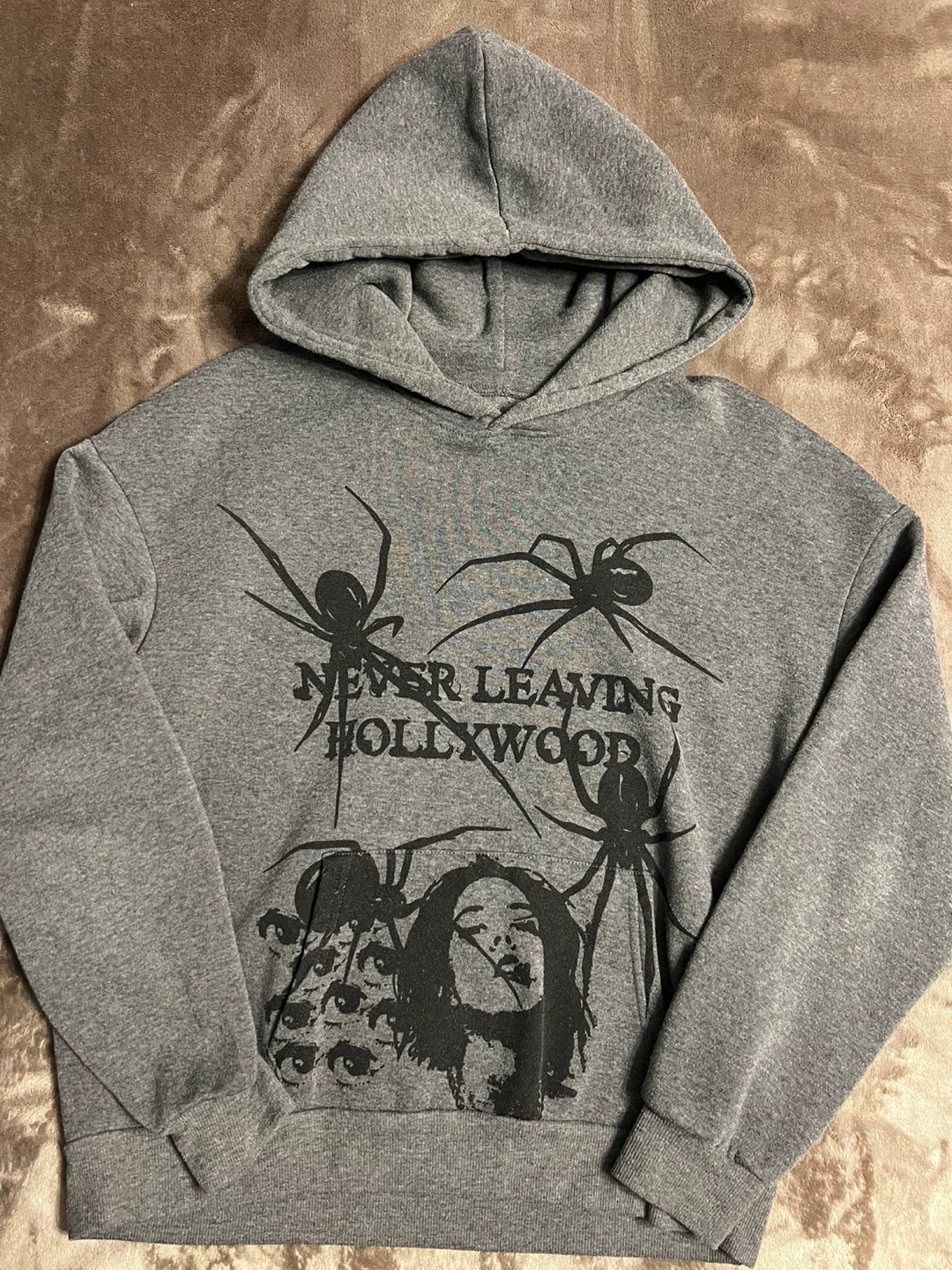 Grey hooded sweatshirt with 'Never Leaving Hollywood' graphic and spider print on the front. It's made of a soft, comfortable fabric blend. Fits S - M. Pickup McKenzie or Somerset. Meetups also available.