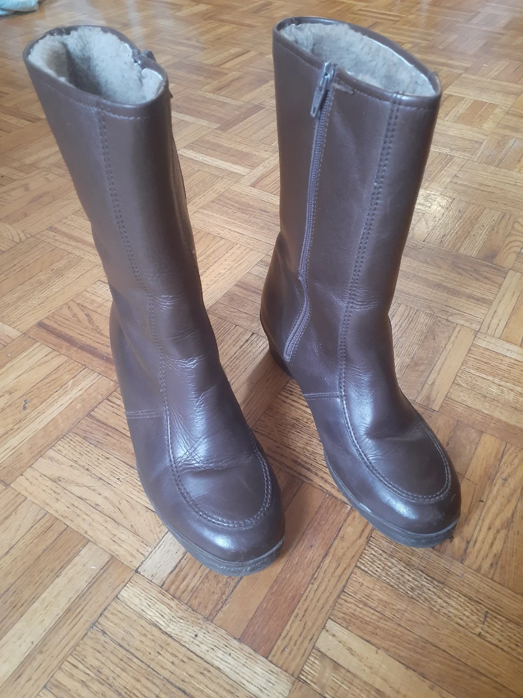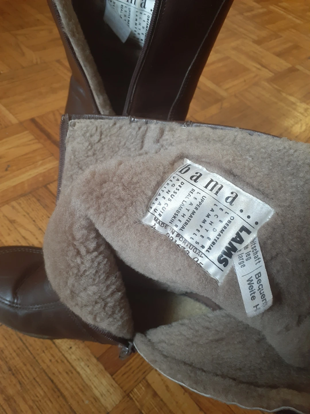 LAMS boots made with leather upper material and a warm lambskin lining. These mid-calf boots feature side zippers for easy wear. Made in Portugal.