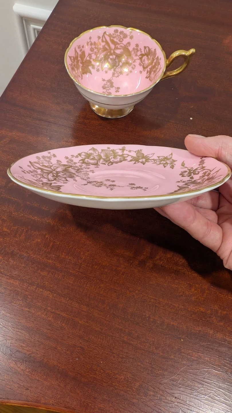 Selling a Coalport Bone China tea cup and saucer set. It's a beautiful pink colour with gold floral detailing. The bottom of the cup reads: 'Coalport Bone China Made in England Estd. 1750'. Pattern 10169/c