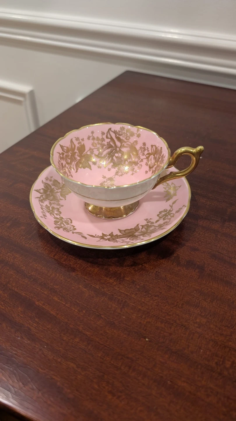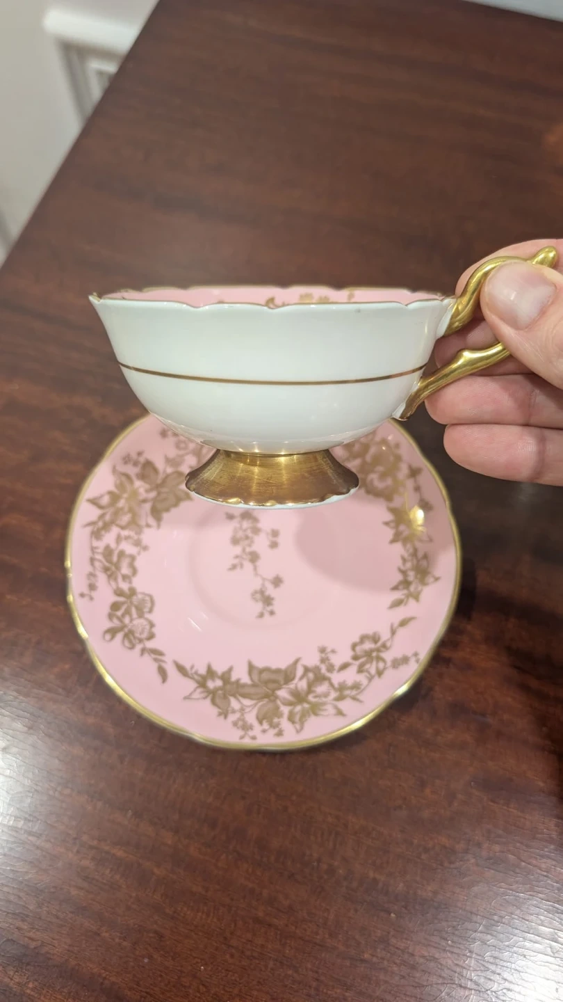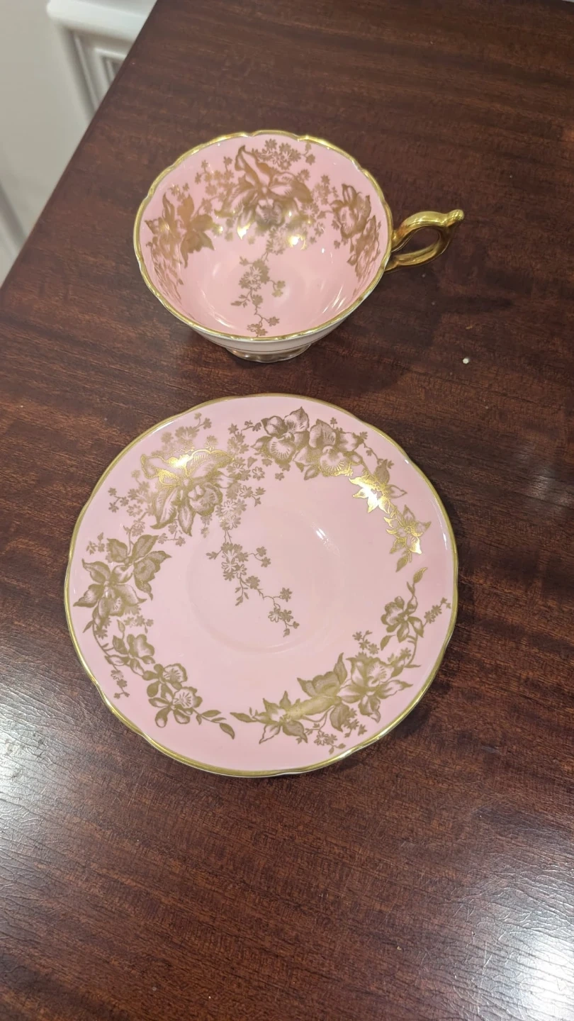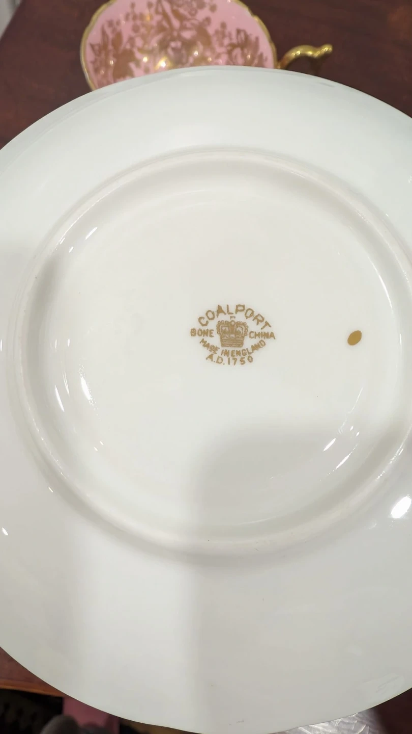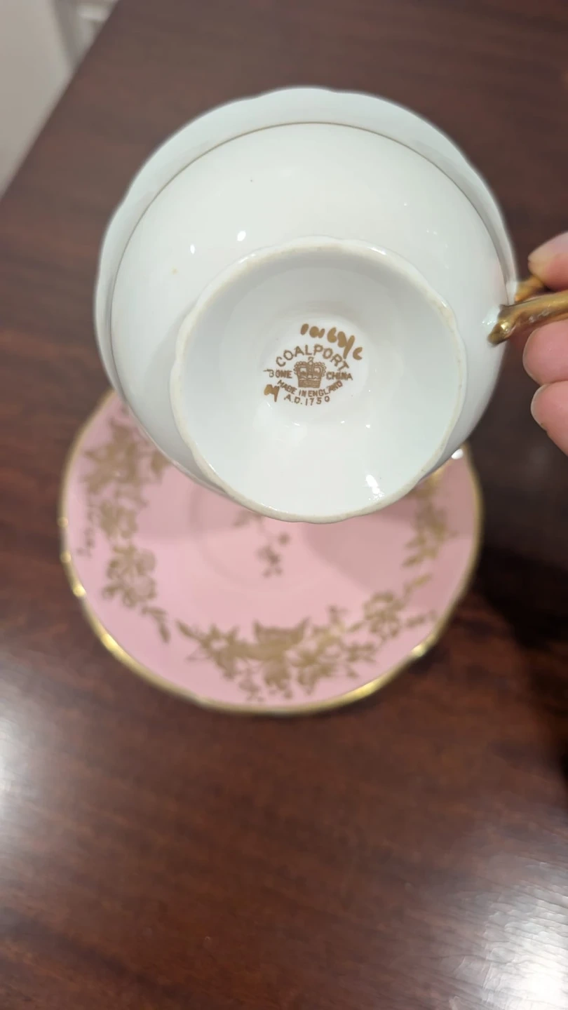 Selling a Coalport Bone China tea cup and saucer set. It's a beautiful pink colour with gold floral detailing. The bottom of the cup reads: 'Coalport Bone China Made in England Estd. 1750'. Pattern 10169/c
