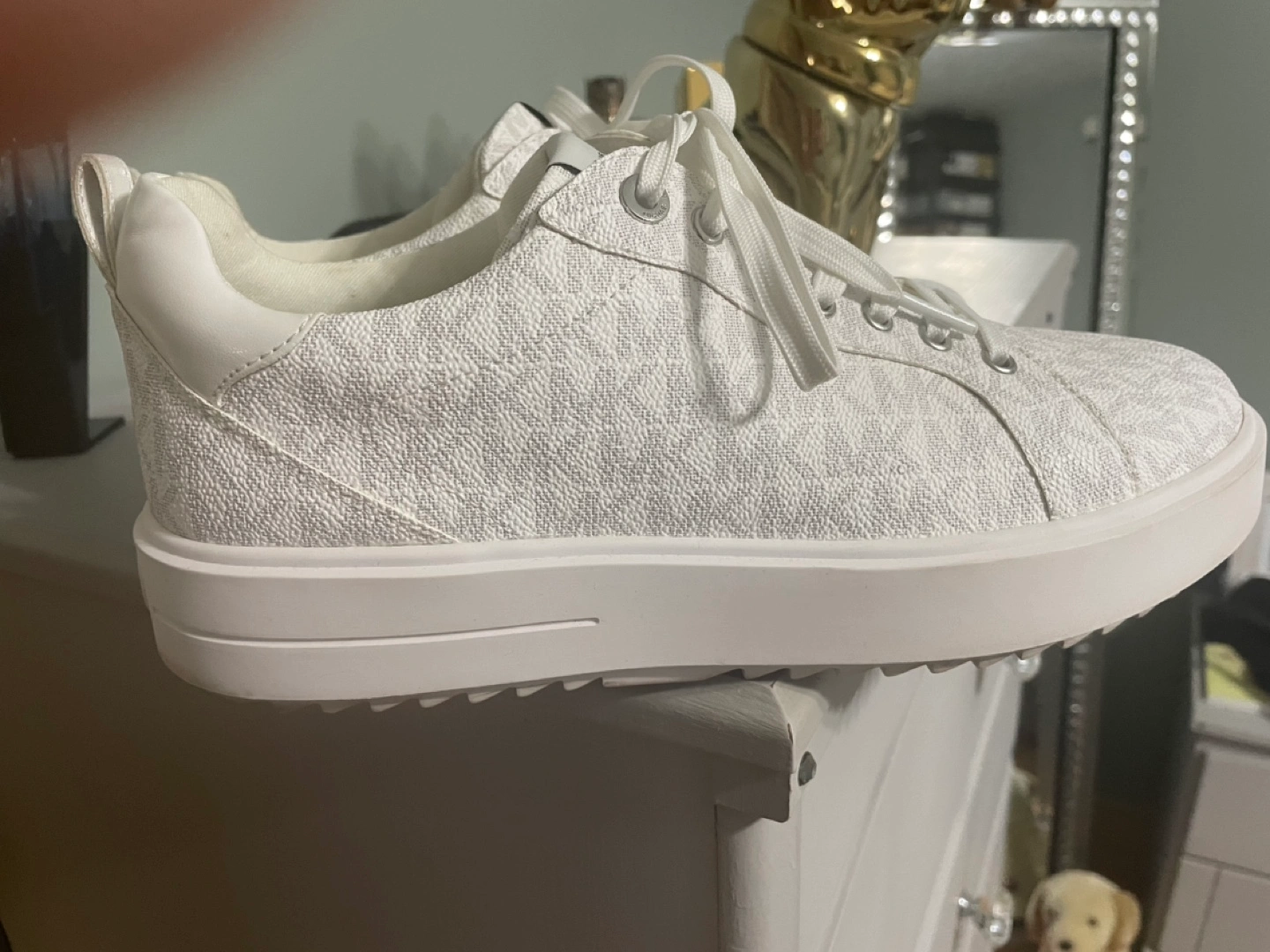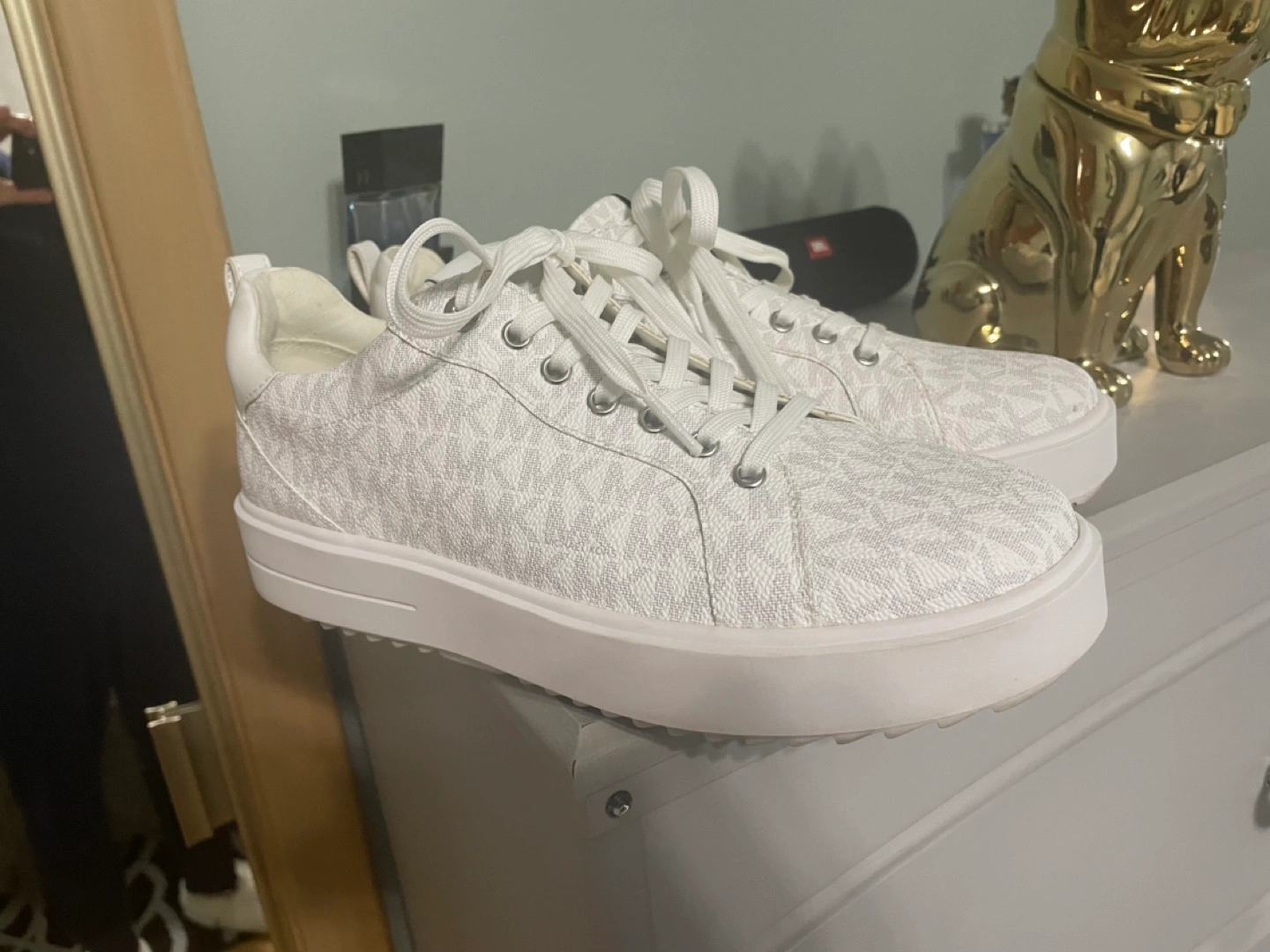 Pair of white Michael Kors sneakers. Low-top style, lace-up closure. White platform sole. MK logo pattern throughout.